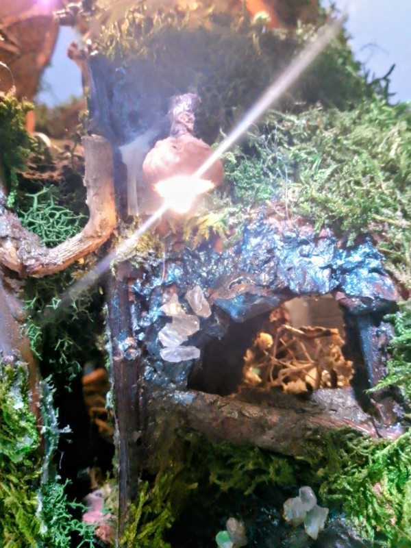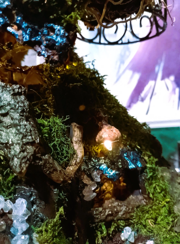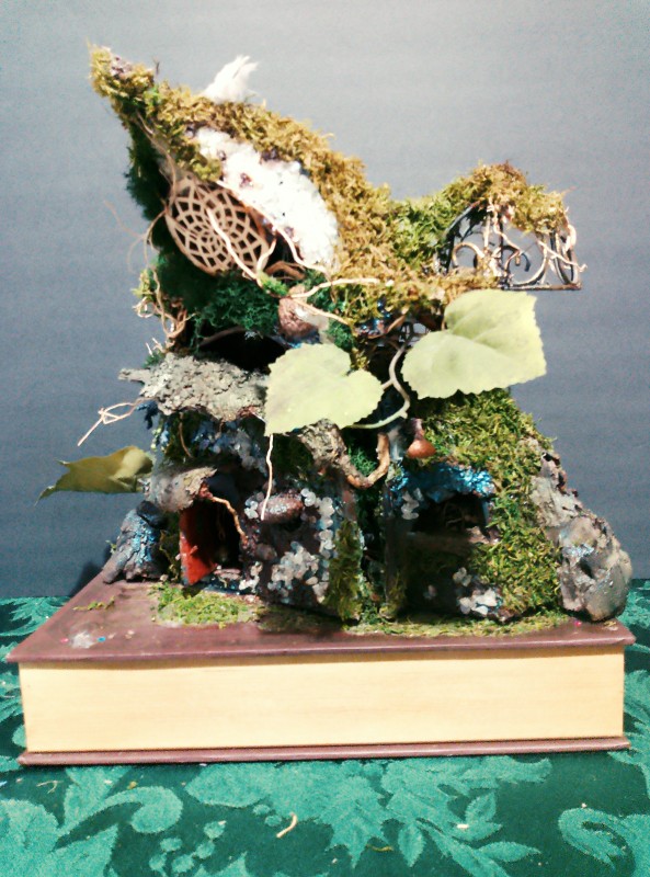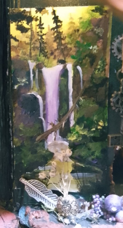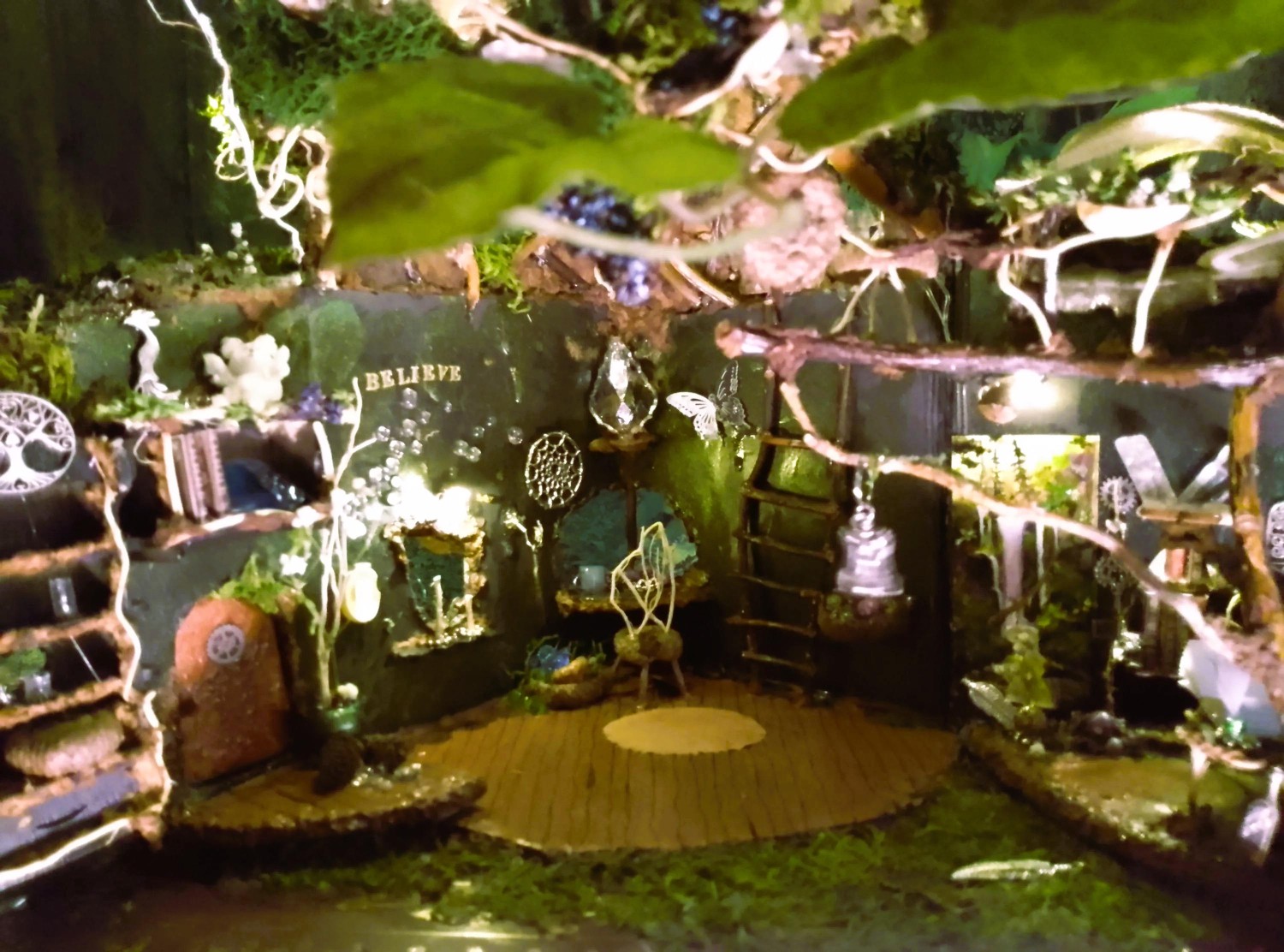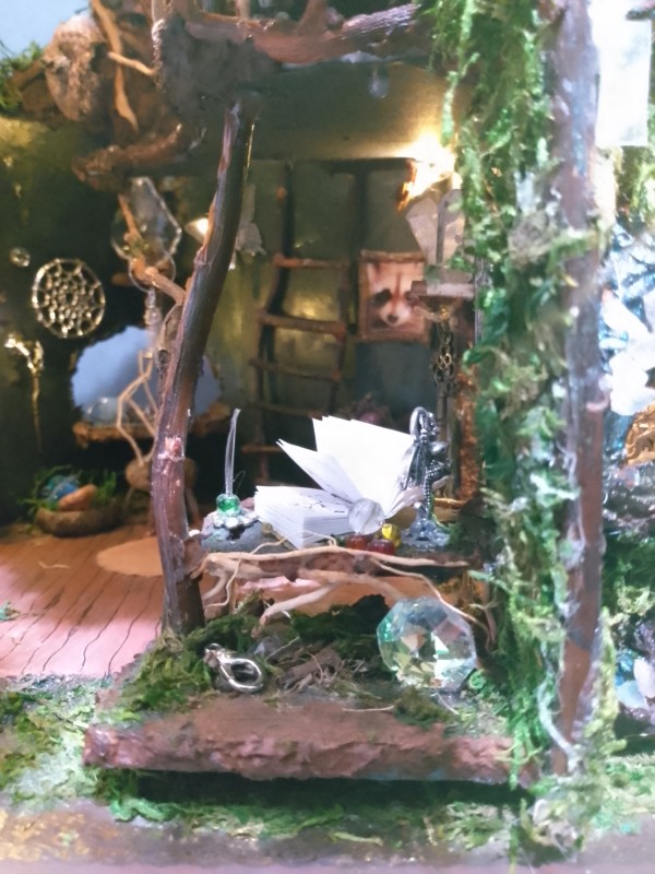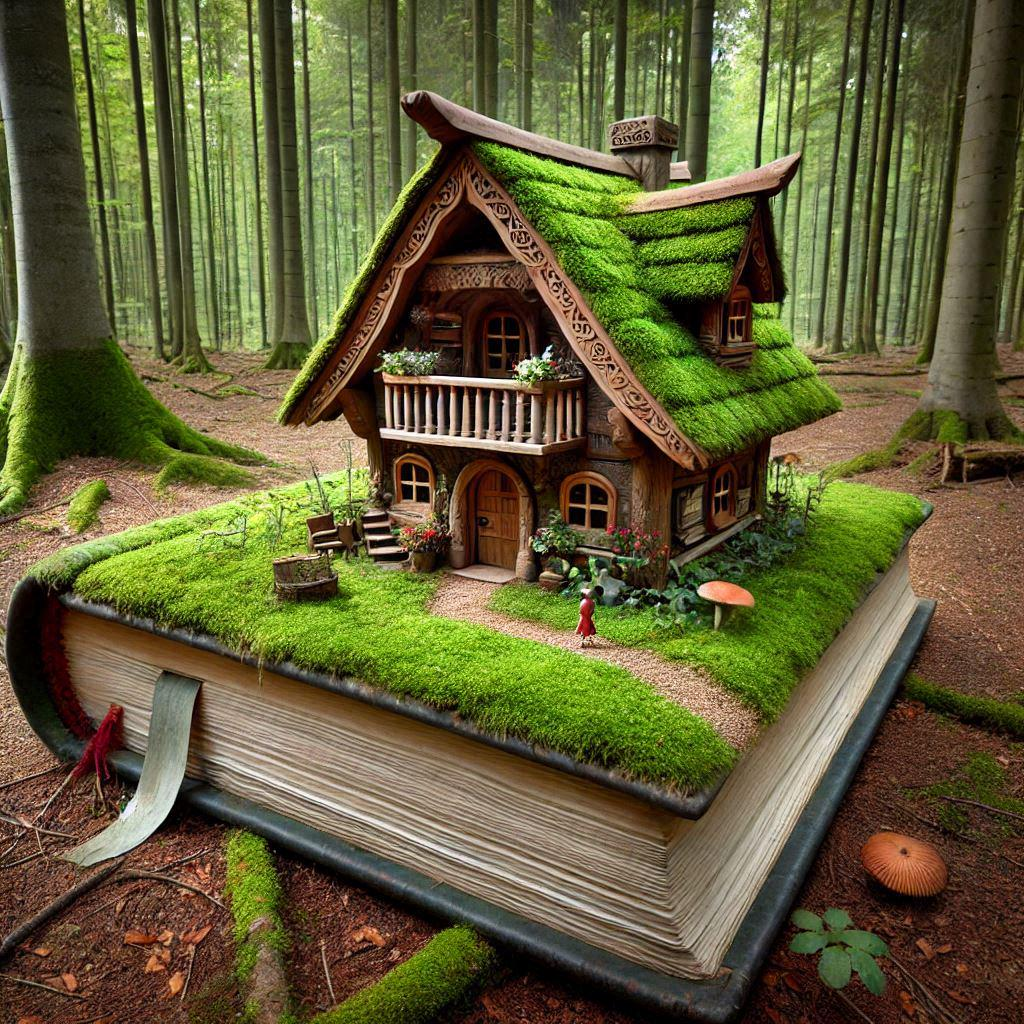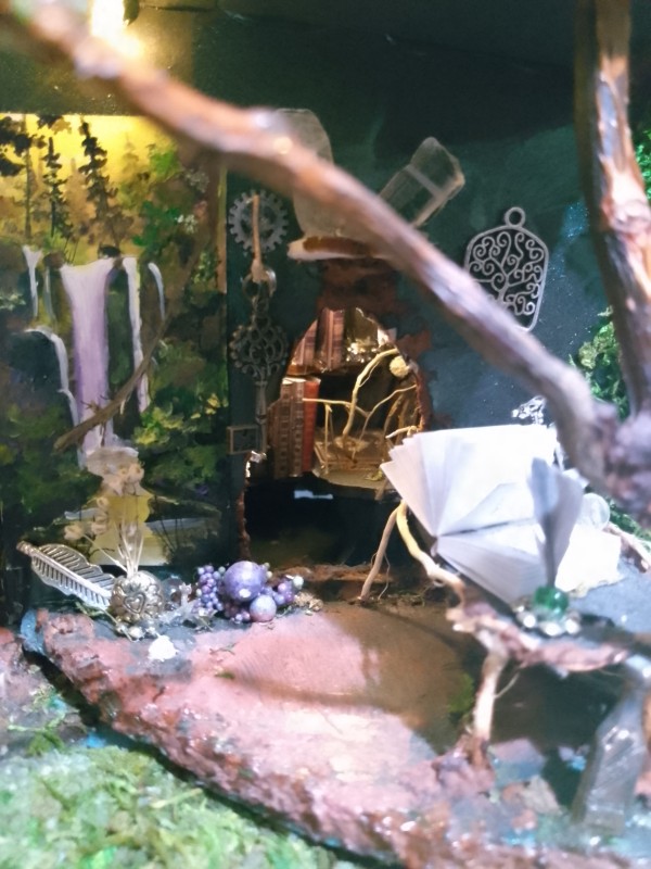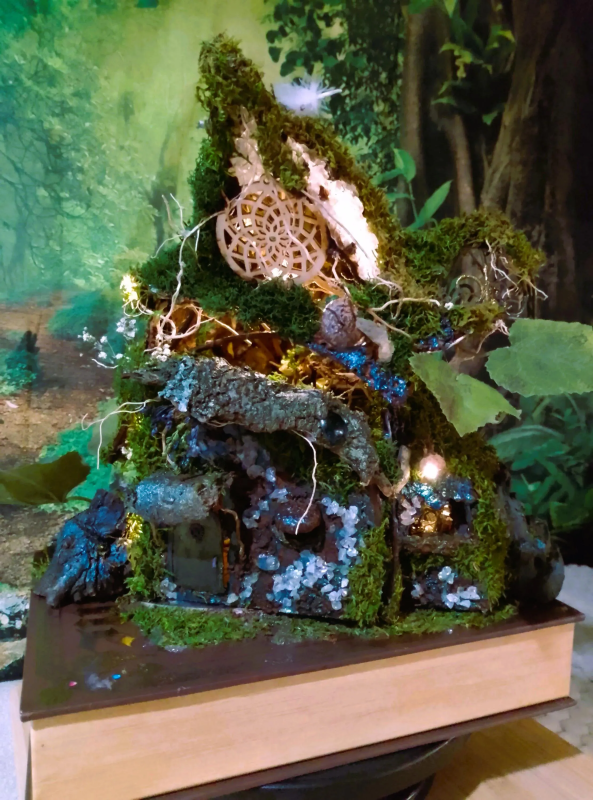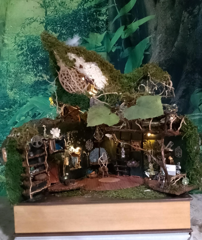 In a quiet forest, a fairy named Miranda has made her home within the cover of a forgotten storybook. Delicate spider‑silk curtains flutter at her doorway, wildflowers bloom along the spine, and treasures from her wanderings fill the rooms—a polished acorn table, a gossamer bed, and a nutshell of dew. The heart of her abode is an acrylic waterfall painting by Pac’i, its lifelike beauty a reminder of adventures beyond the forest, where wonder always awaits her wings.