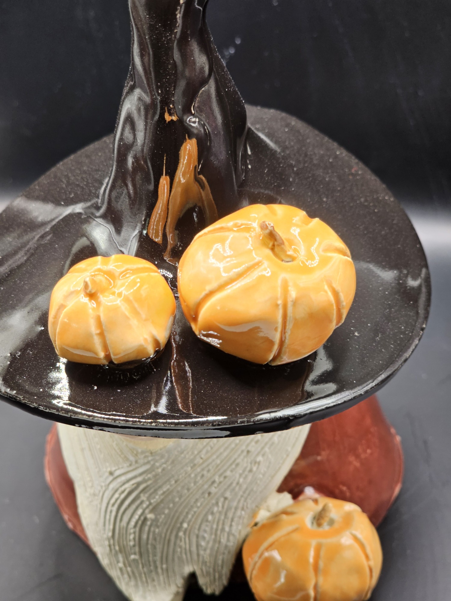 This gorgeous gnome wants to grace your garden or home! He has a deep red cloak, a black hat and a bevy of pumpkins!