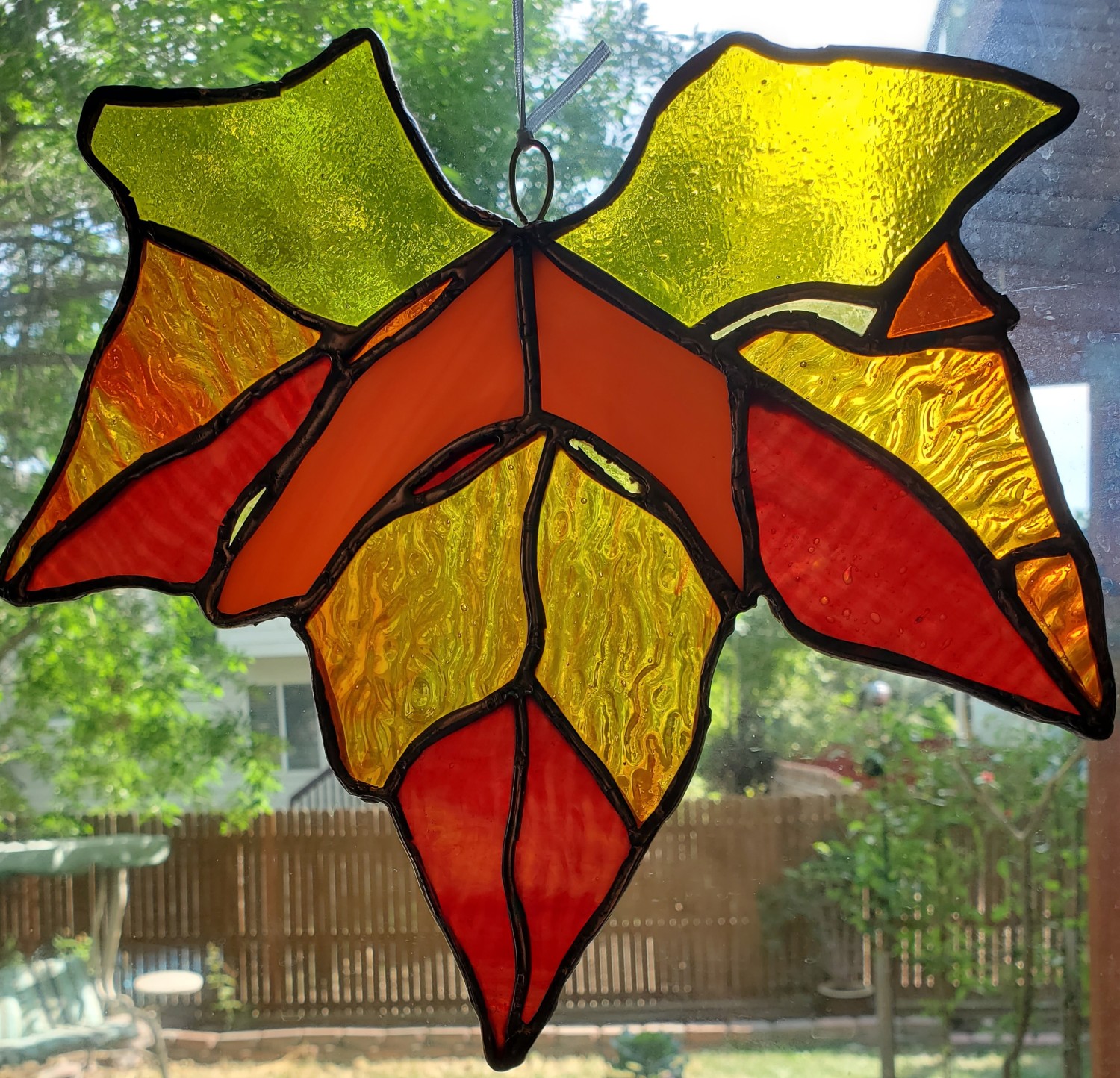 Autumn is right around the corner and Dwen's favorite color is Fall! To acknowledge this gorgeous, yet short season, she created a maple leaf showing off all of the gorgeous colors that can be seen in nature. This piece comes with an attached loop for hanging in your window.
