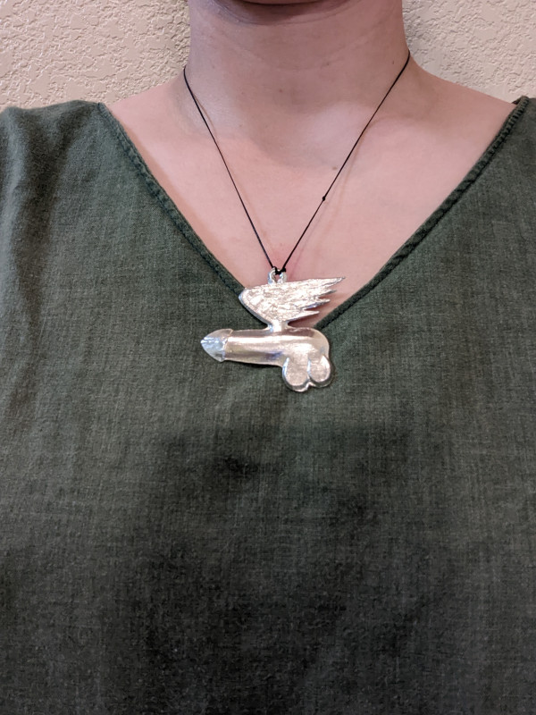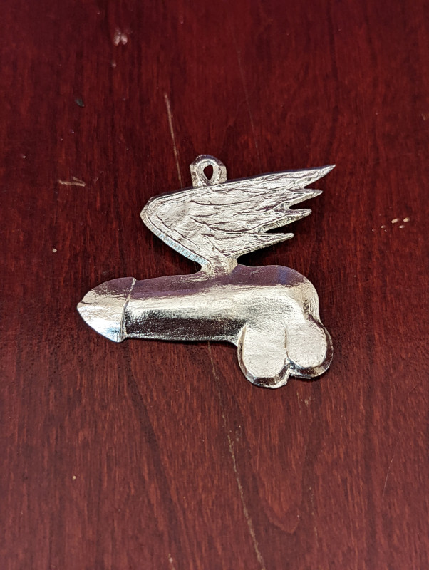 The fascinus (or fascinum) is a depiction of the Holy Phallus from Roman mythology. It is said, at least by Pliny, that the fascinus is a remedy for the "Evil Eye", otherwise, protection from outside influences that may be malevolent. It's the word from which the English "Fascinate" is derived, meaning "To bewitch, to enthrall, to consume or command the attention of", and its purpose is to protect from fascination, or bewitching. Archaeological evidence shows us that the charm was often given to children, usually in the form of a small ring, and appears to have been more commonly worn by children than by adults. It was believed that the strong emotion evoked by the sacred image, be it humor or shame, was itself the power that averted the Evil Eye. Either way, always be protected by the power of laughter (or grumpy glances) with your very own fascinus.