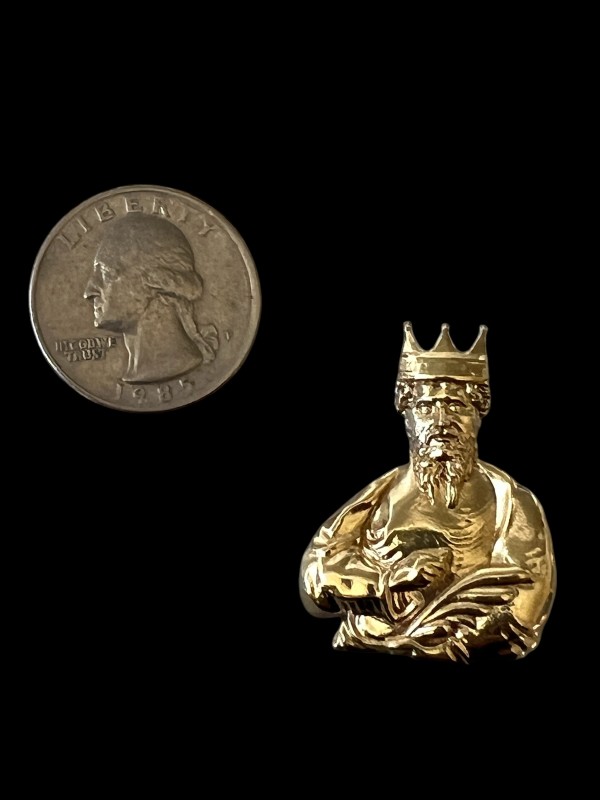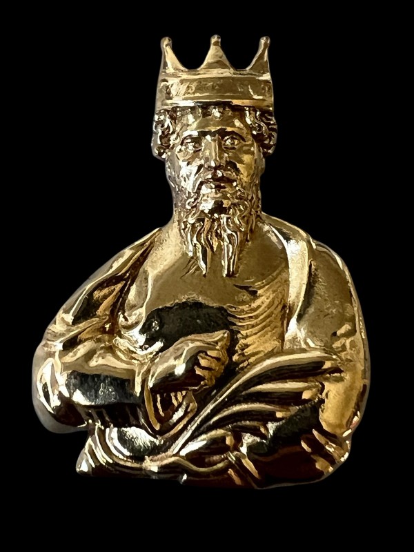 This pin is based on a drawing of the master or magistro from Fiore's treatise. It is about 1 1/2" tall and full of rich detail.