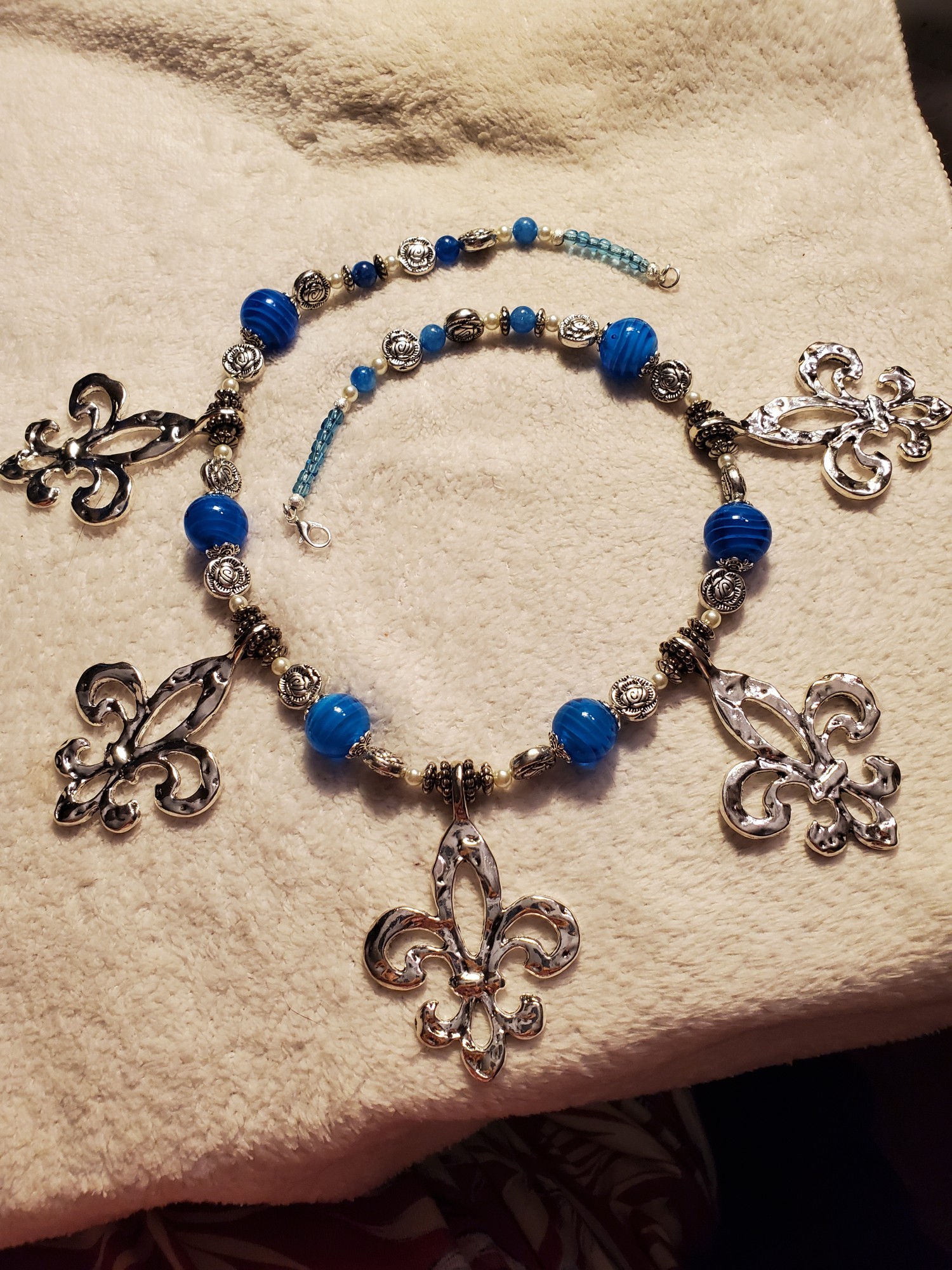 Fleur de Lis Lamp Work Ocean Blue Statement Necklace