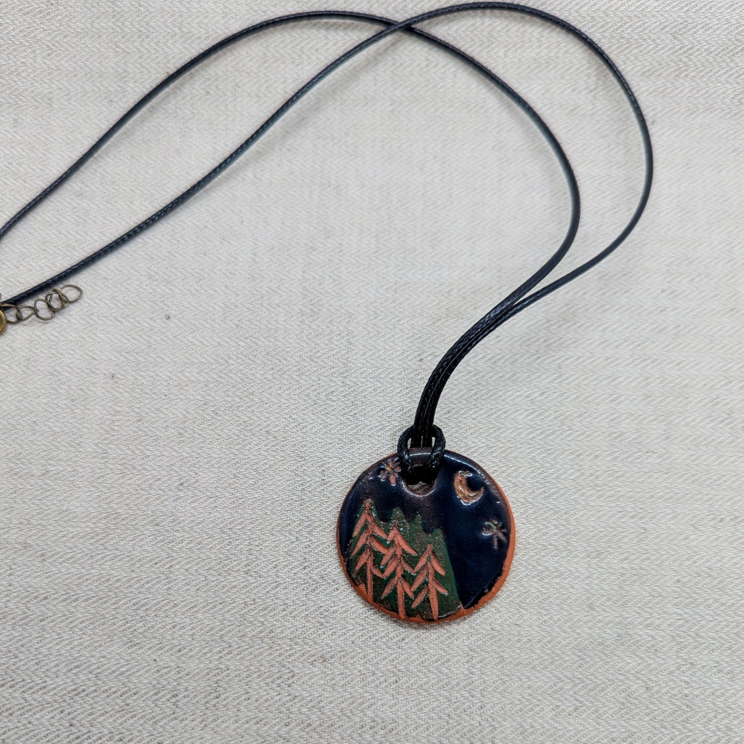 Hand craved terracotta pendant featuring a night time forest