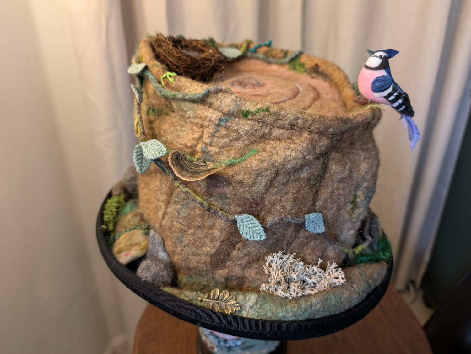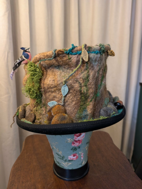 Each one is different, and created to suit the hat as it goes. I add moss, embroidery, beads, lichen, wood, miniatures, creatures, roots, vines, leaves... letting the hat lead me as it is being crafted.