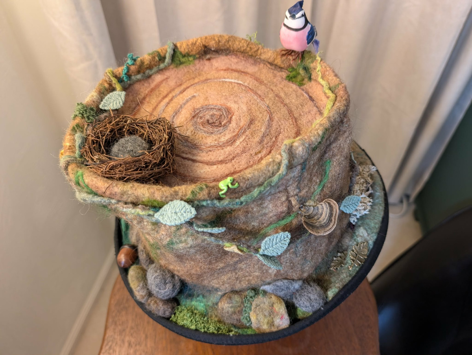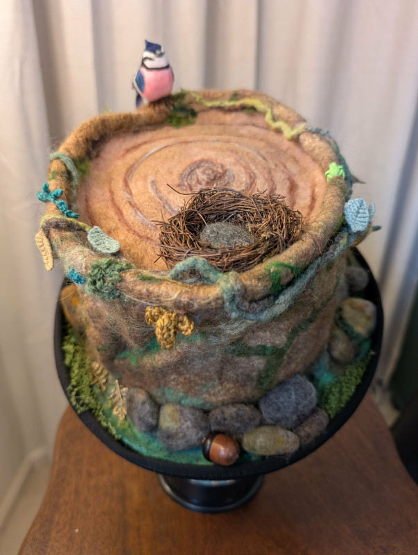 This tiny bird is ready to welcome spring with a small nest in a secure location! This hat is a world onto itself, with much exploring to be done. With small metal leaves and felted stones in the brim, and a trailing vine. It also features a small wood tuned acorn that can be unscrewed... what you put in there is up to you. Meds? Birdseed? Wildflower seeds? A tiny love note?