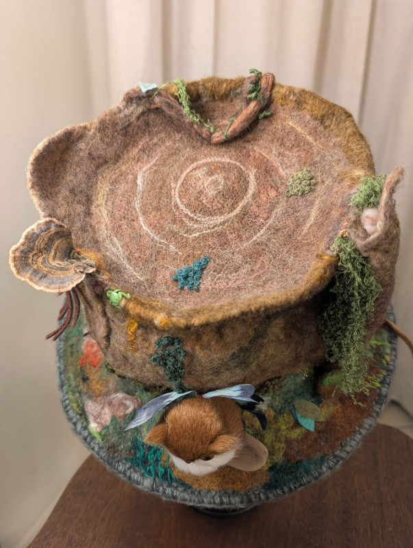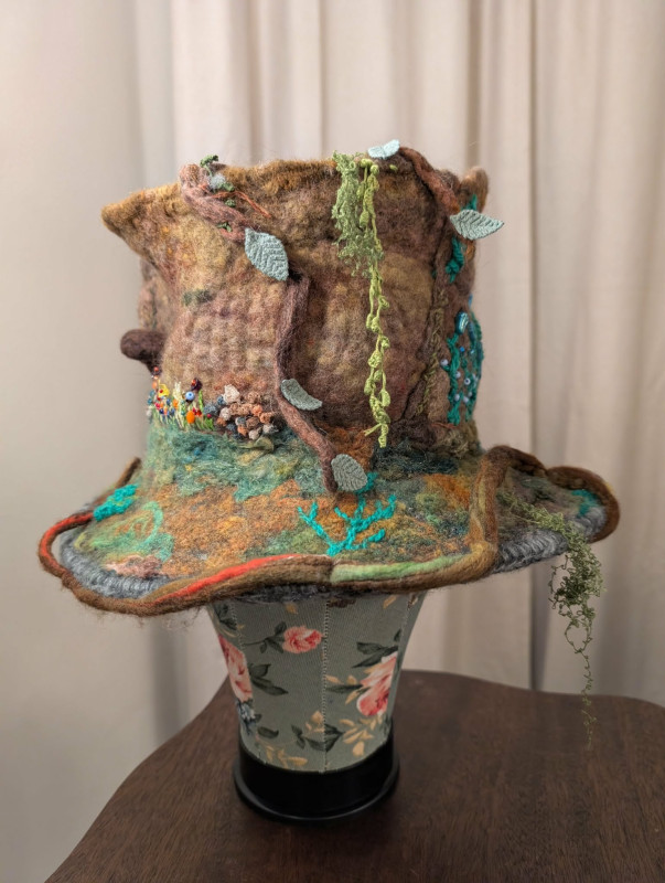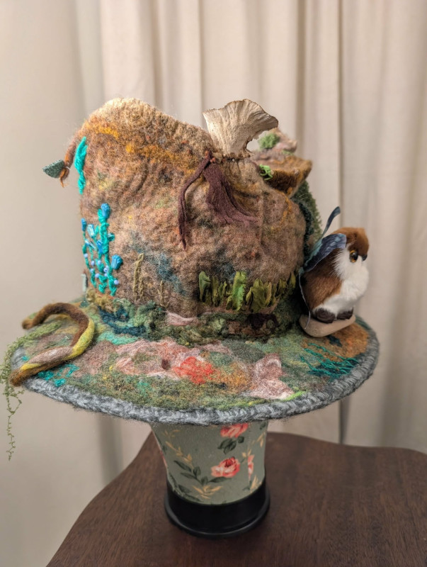 Each one is different, and created to suit the hat as it goes. I add moss, embroidery, beads, lichen, wood, miniatures, creatures, roots, vines, leaves... letting the hat lead me as it is being crafted.