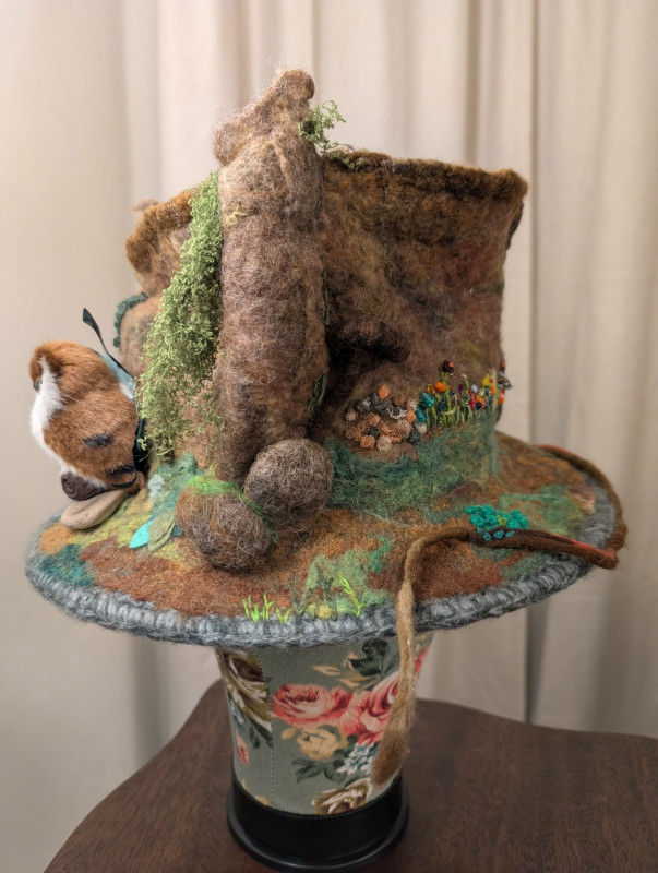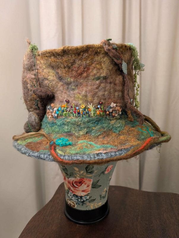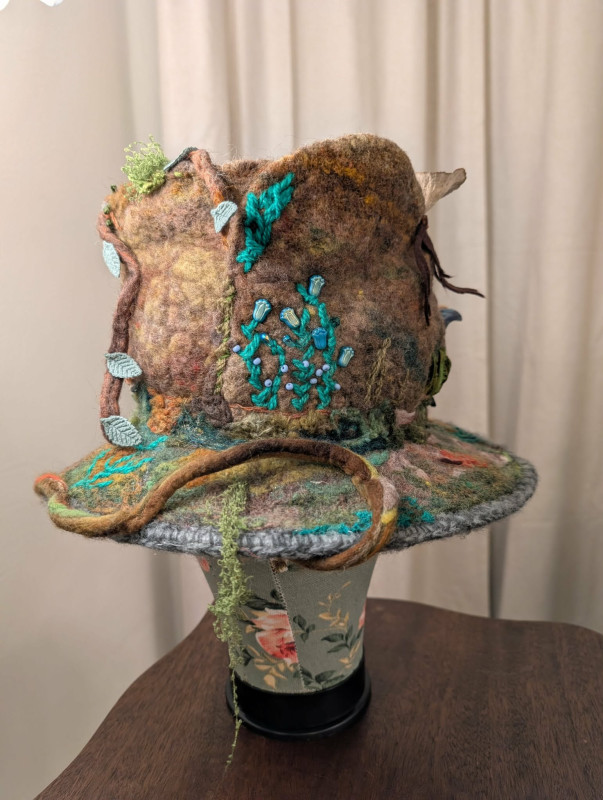 My hats are a combination of wet and needle felted art, embroidered, embellished, and enjoyable to wear. They look great in photos, but they look magical when you wear them.