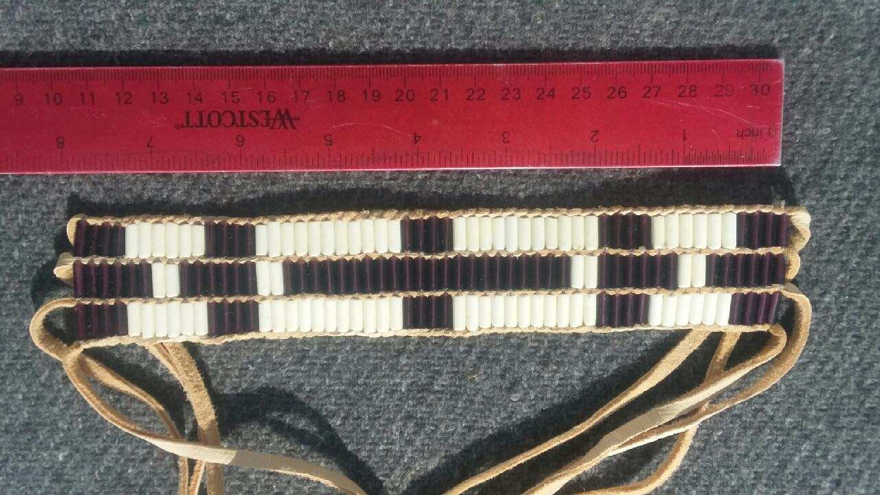 This is a new choker-style necklace made of striking dark purple & ivory glass wampum beads hand-woven onto deerskin lacing & finished with dark red glass padre beads Choker measures approx 8" × 1.5" of beadwork and 30" overall. It can be slipped over the head and adjusted to size by sliding the padre beads on the lacing.