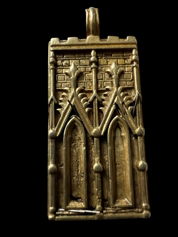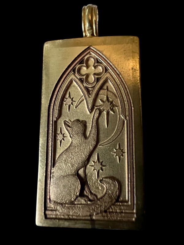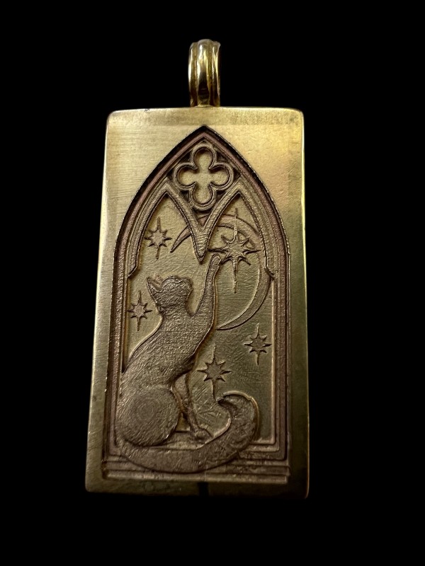This cute cat is set on a brass medallion, which is two-sided, featuring a medieval-style building on the other - the better to set the stage for what's going on IN the castle!