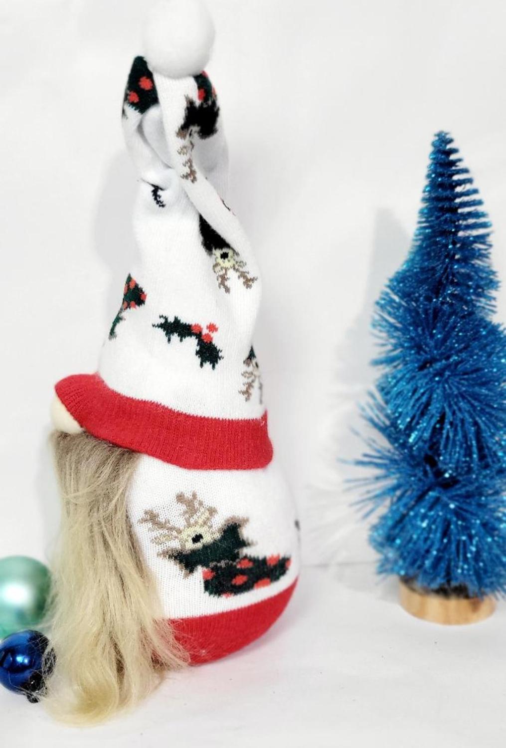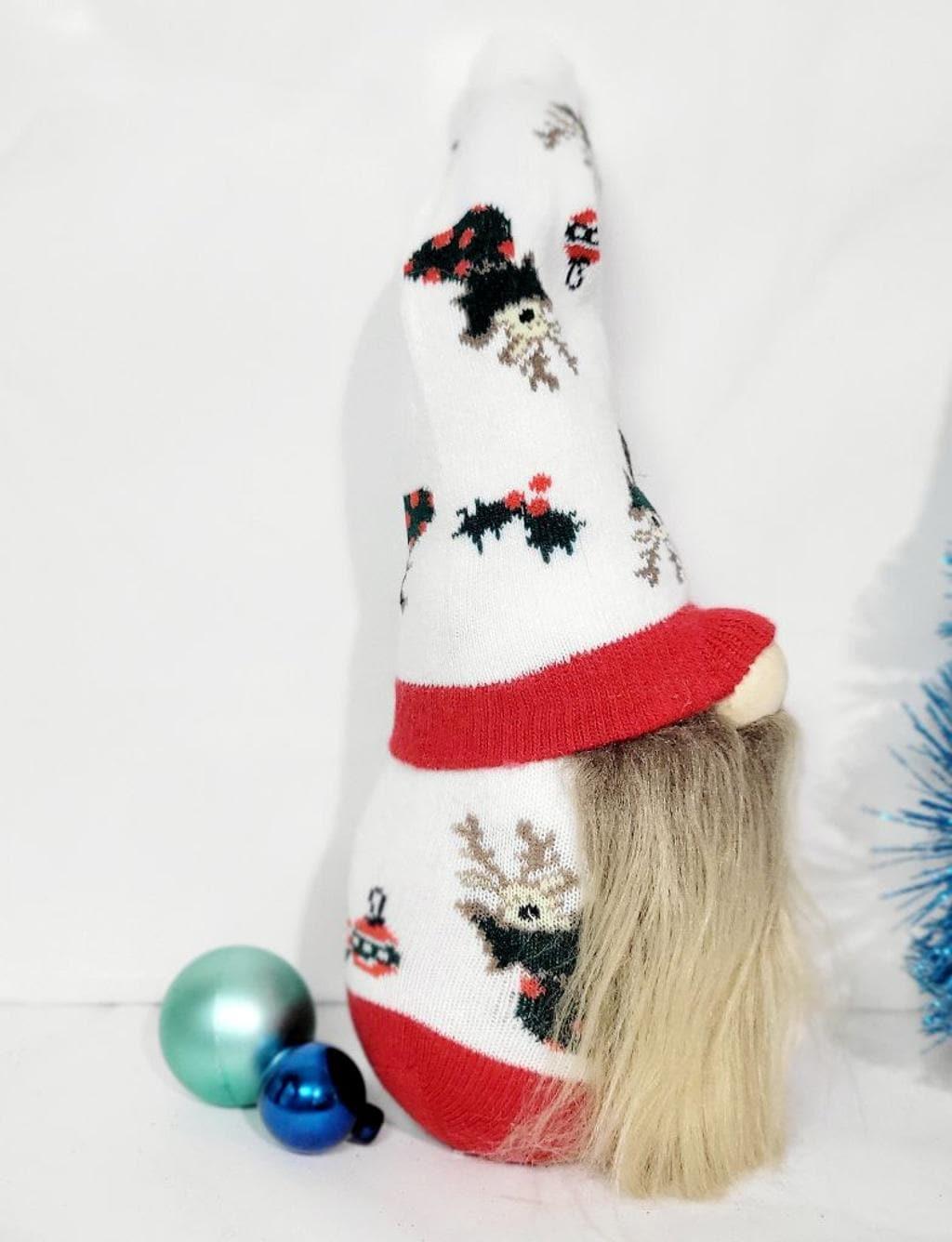 Hand crafted, weighted with premium materials, Christmas sock gnome, with reindeer and mistletoe printed on the white sock, with matching hat, with a white pom pom, a wood nose, and dirty blonde beard. He measures approximately 8" tall.