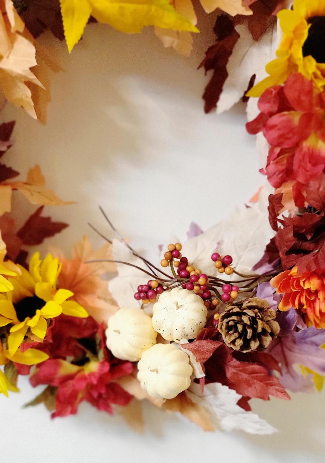 Hand Crafted Festive Fall Autumn Thanksgiving Wreath Door Hanging with Sunflowers and Pinecones