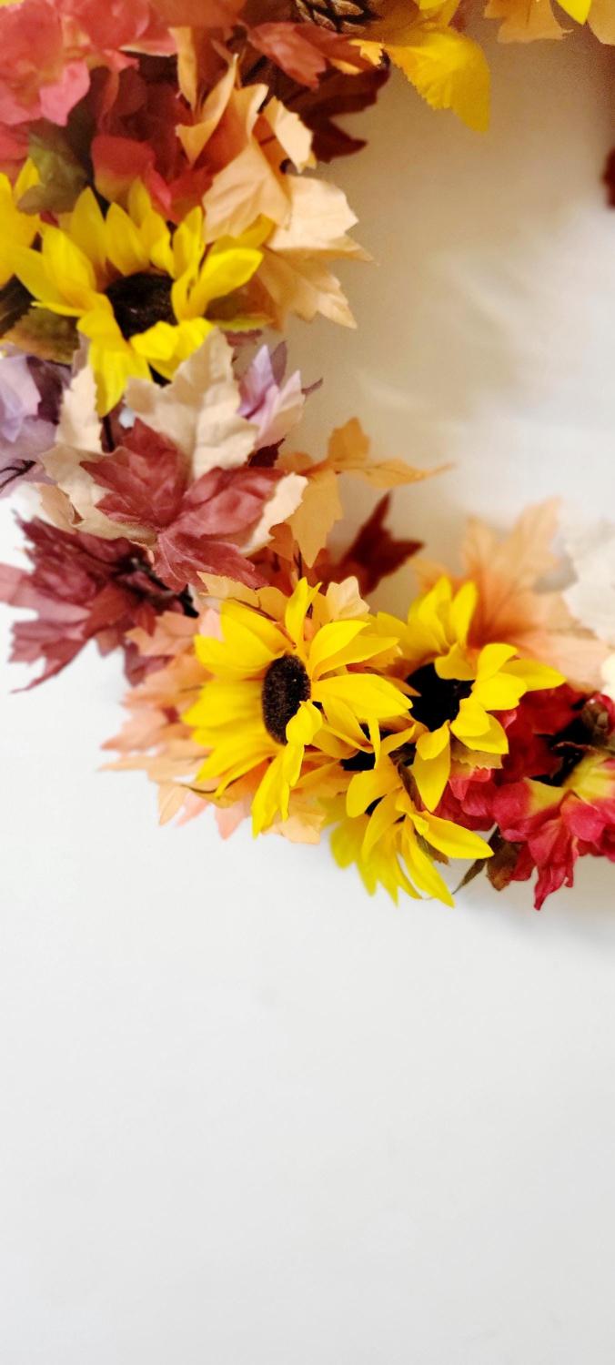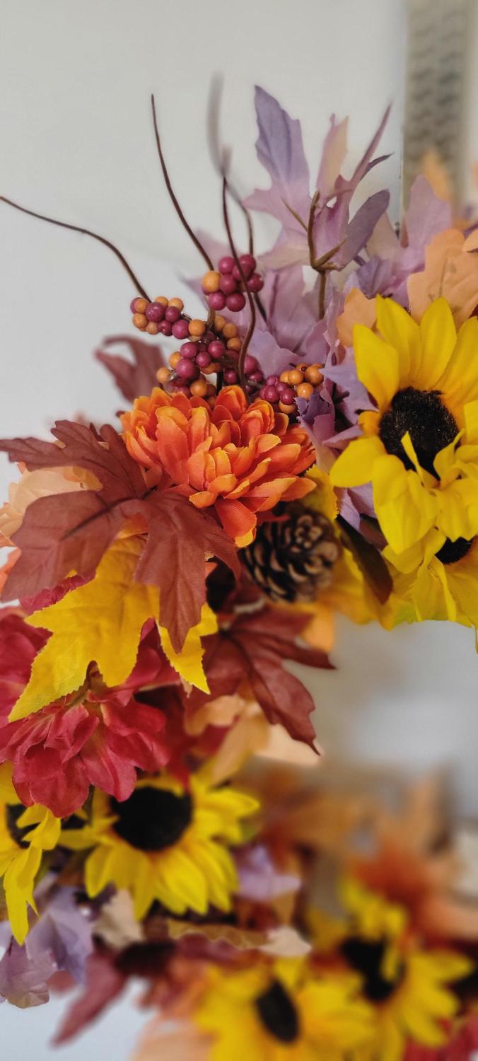 This beautiful autumn wreath is hand crafted and features vibrant sunflowers, pinecones, and colorful leaves. Perfect for holiday decor, this wreath will add a touch of warmth and cheer to your home. The wreath is designed with a festive and seasonal theme, making it a lovely addition to your fall decorations. Measurements are approximately 16" diameter and 4" depth.