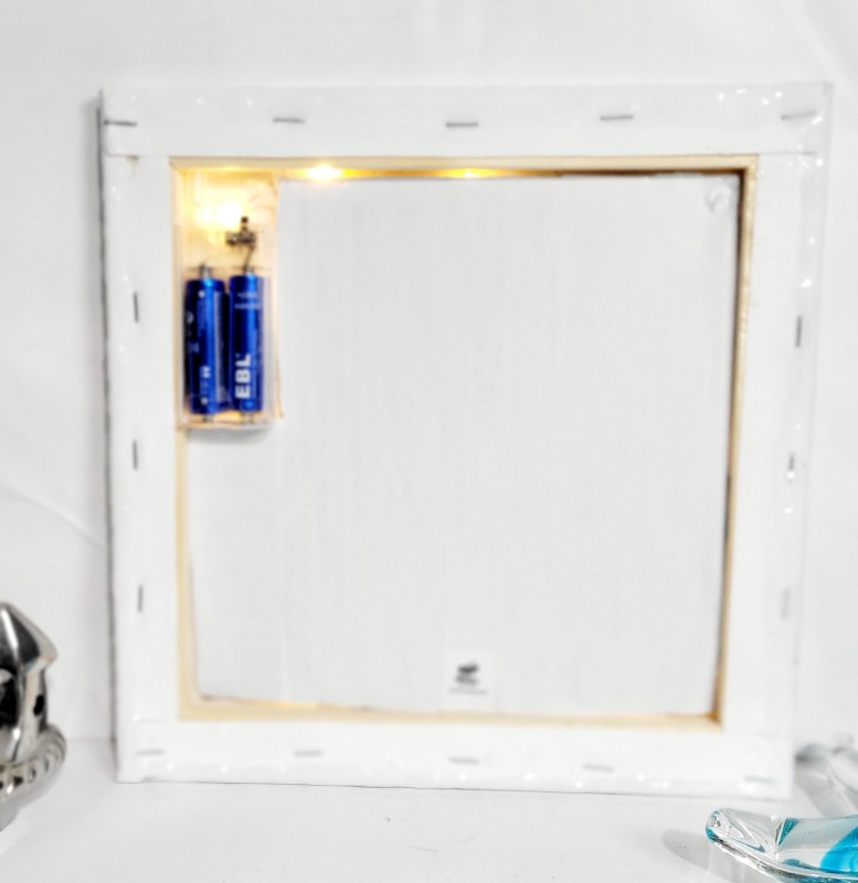 A handpainted mermaid in purple and blue, with glitter to highlight her tail and the water bubbles, with crushed glass to add dimension (warning: there are a few high points of glass), covered in resin, and lit from behind with a string of battery operated fairy lights. The lights are new but the casing was cracked during production. Canvas is 10x10" and will come with a hanger.