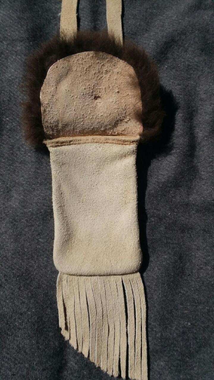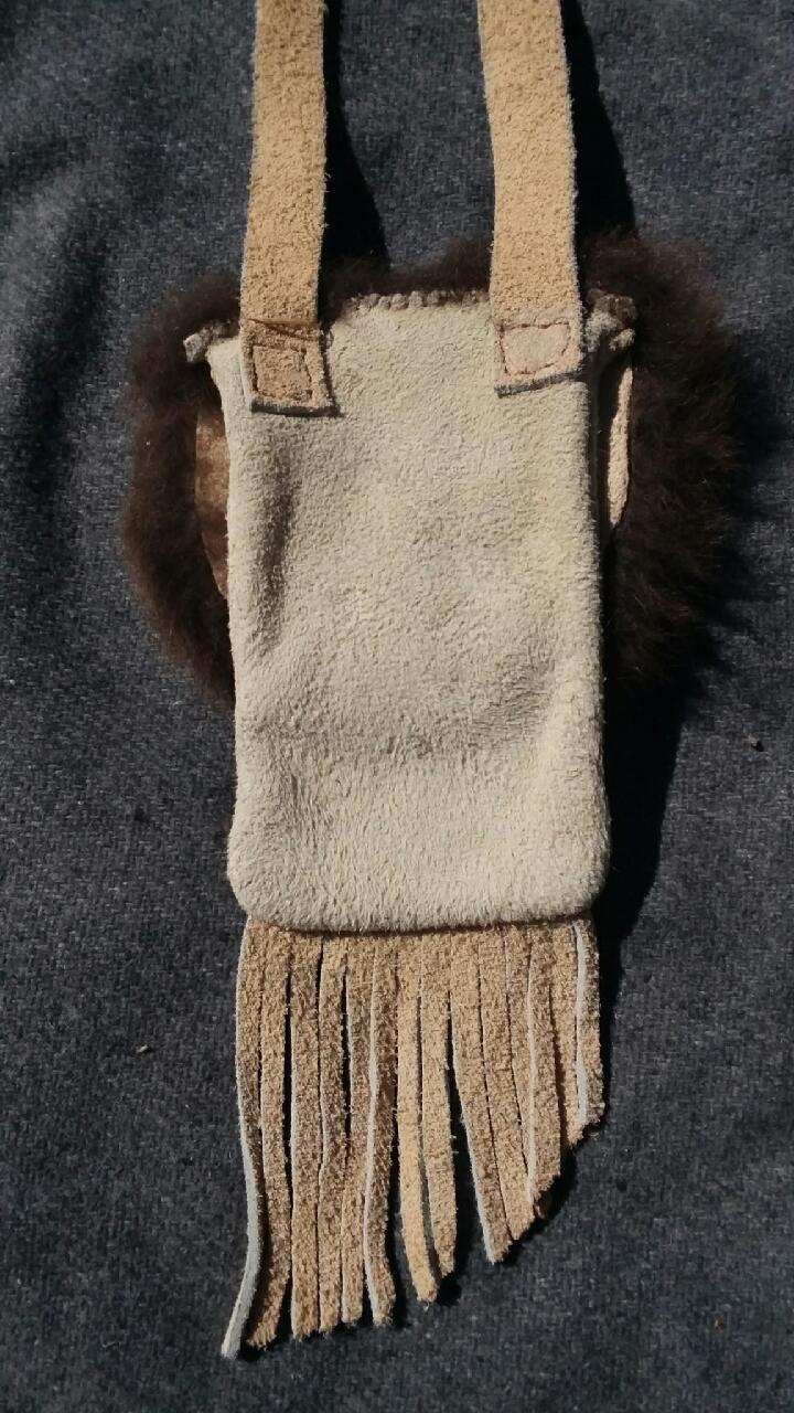 the pouch, strap, and fringe are made of split buffalo (bison) hide