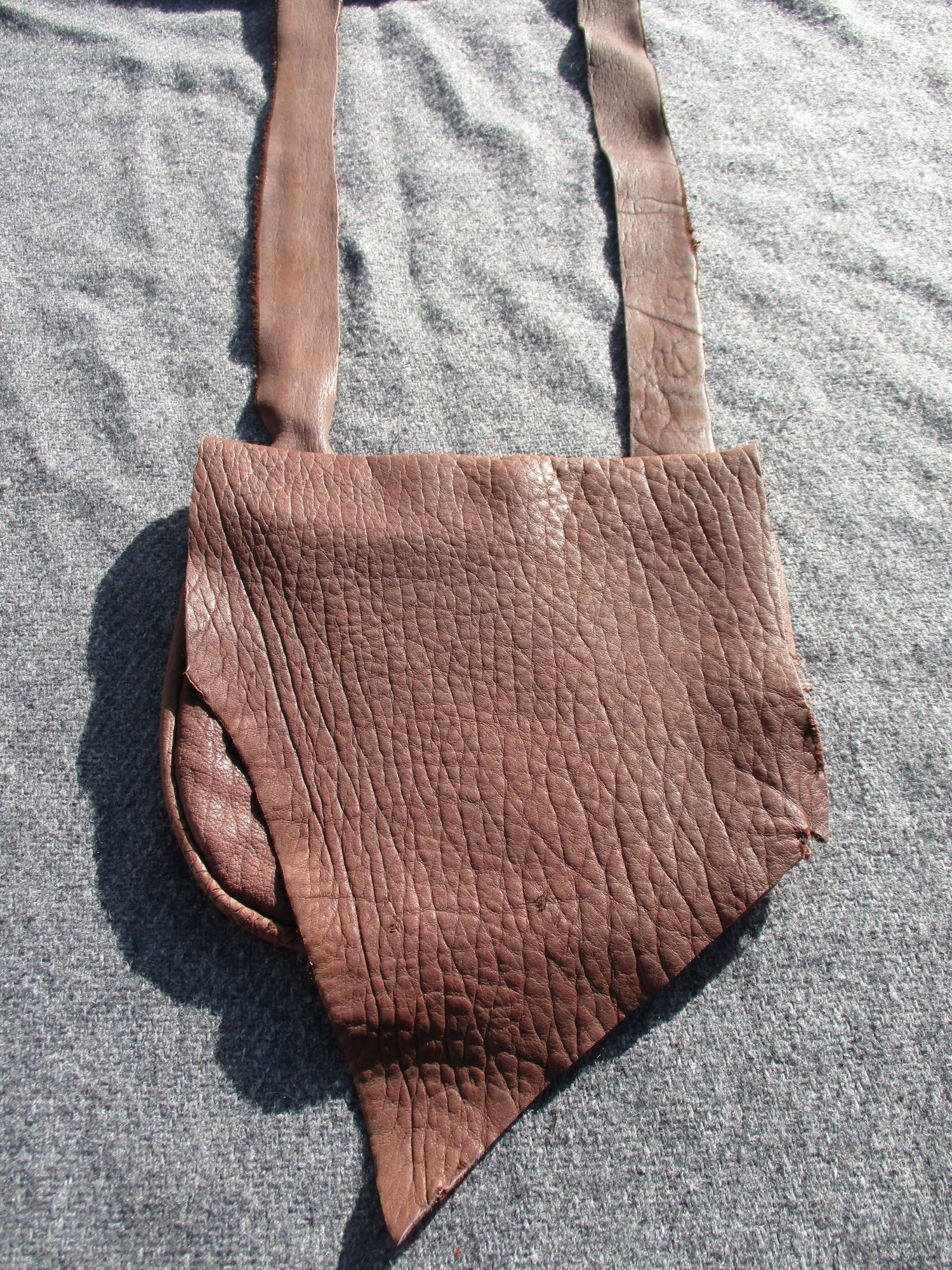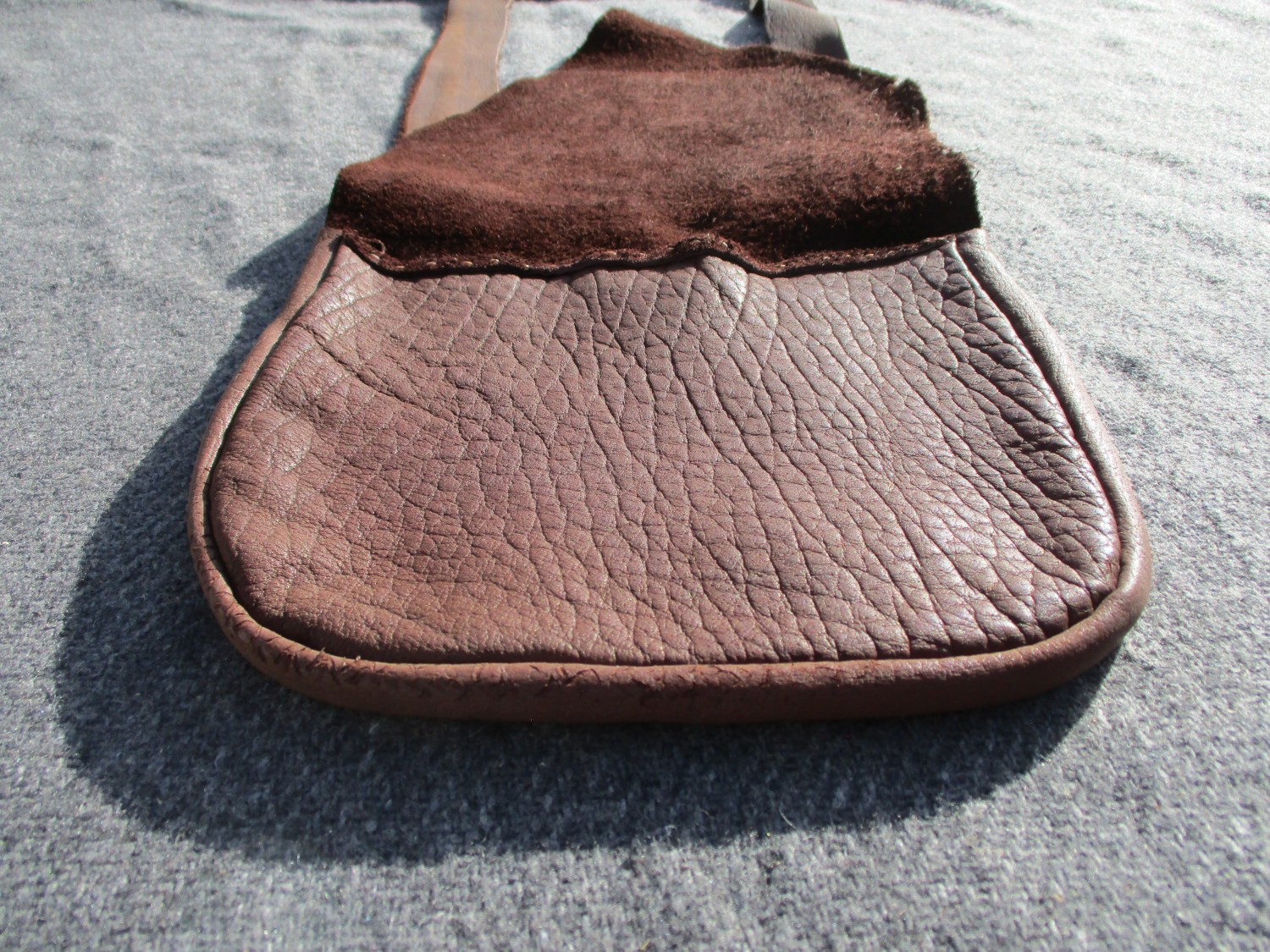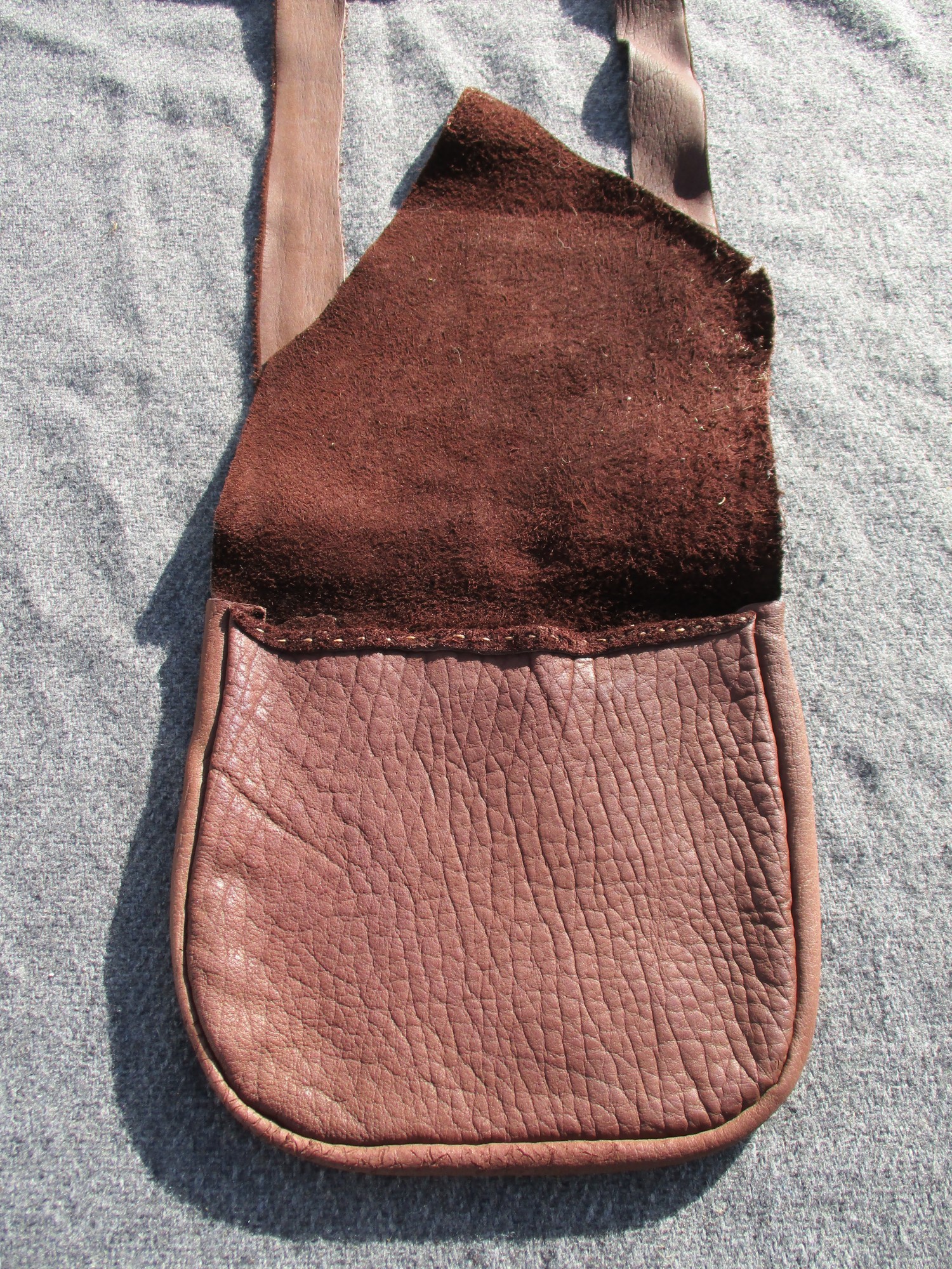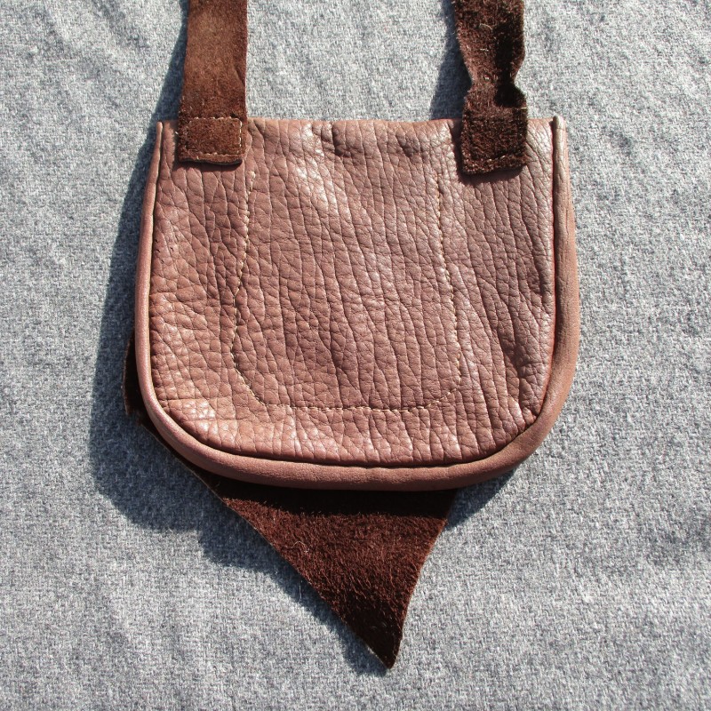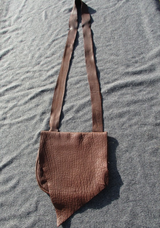This soft, handstitched bison leather bag measures approx 7.5" wide by 7" long and is a gorgeous chocolate brown color. This bag features a gusset of approx 1" wide for some extra space for all your possibles. The strap has a drop of approx 25.5". There is an interior pocket stitched to back panel that measures approx 4" wide by 5" long. The oversized front flap is cut from the natural edge of the hide. Perfect bag for reenacting or everyday use!