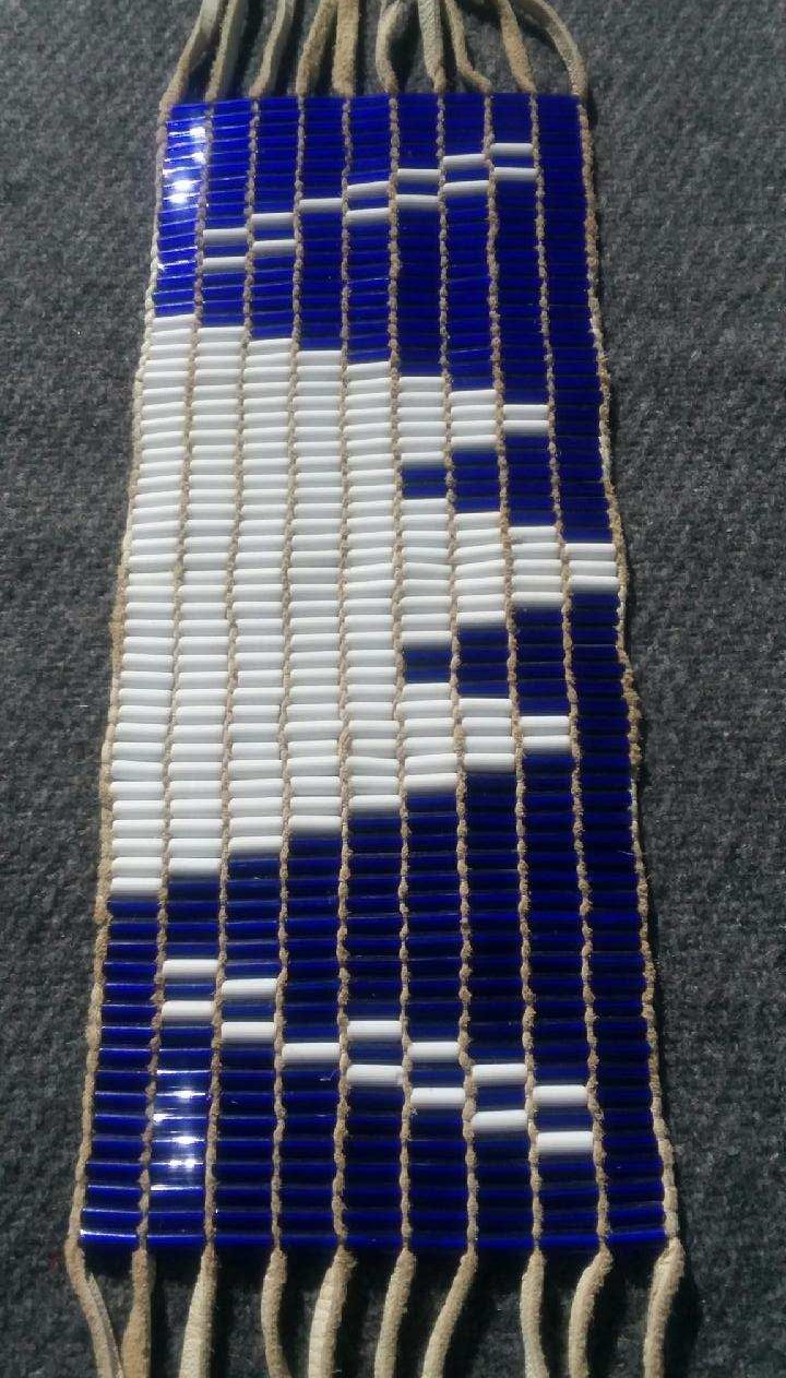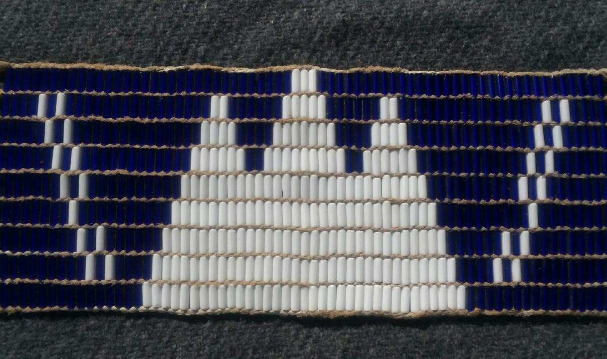 This is a new, handcrafted Wampum Belt made of Glass wampum beads in cobalt & white. Each bead is individually woven onto deerskin leather lacing using sturdy cotton-blend thread. Wampum belts were traditionally used by Native people of the eastern U.S. & Canada to commemorate treaties and record messages. This belt represents the artist's depiction of the Teton Mountains. Approx measurements of beadwork panel are 9.5" x 4". Truly one-of-a-kind!