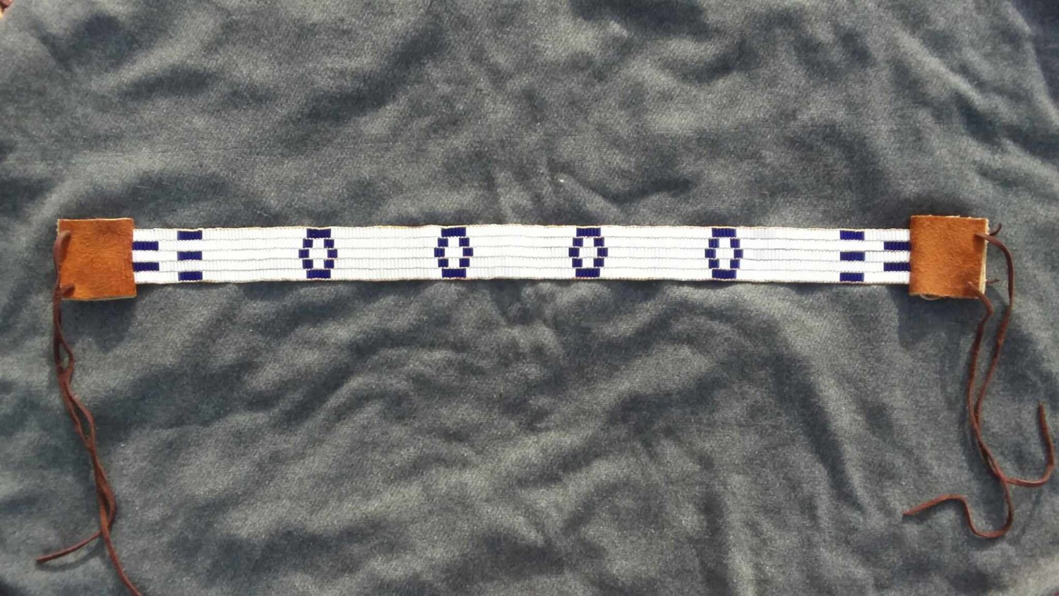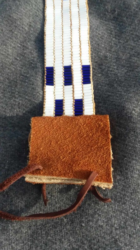 This is a new, handcrafted Glass Wampum Belt made of white & cobalt glass beads, deerskin leather lacing, and bison leather. Each bead is woven onto lacing using sturdy cotton-blend thread. Belt is finished with bison leather end tabs.