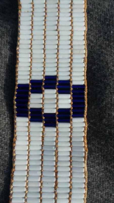 Wampum belts were traditionally used by Native tribes of the eastern U.S. to commemorate treaties or record messages. This belt is adapted from a historical design dating back to the French & Indian War.