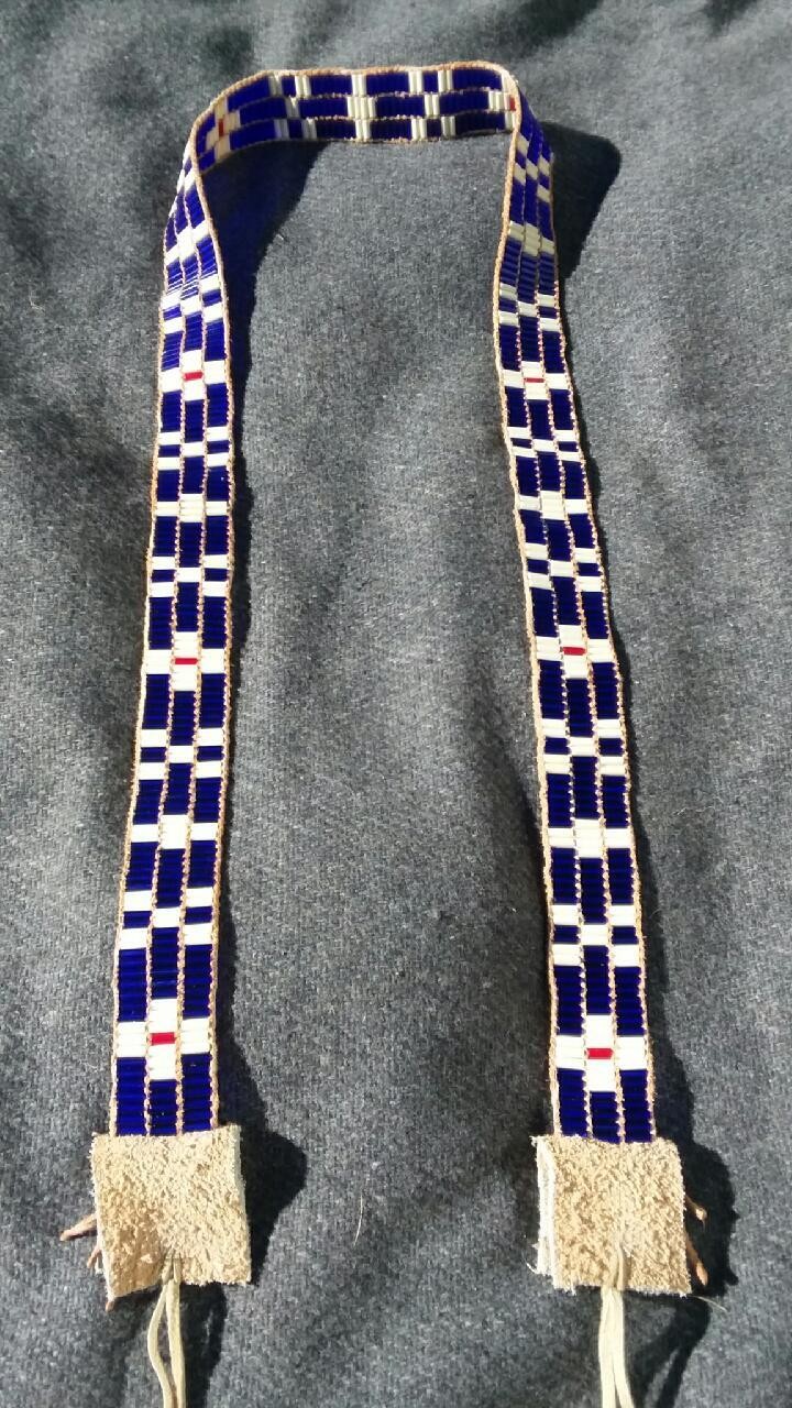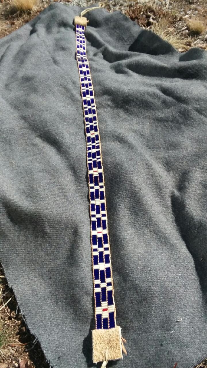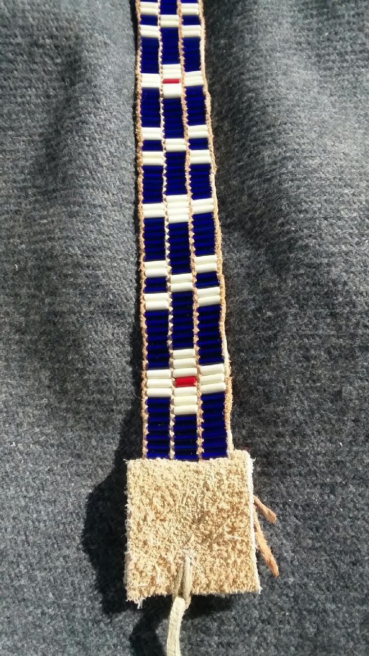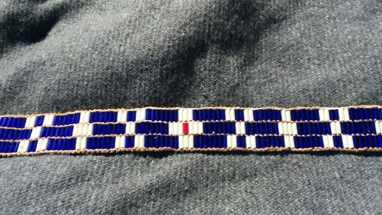 This is a new, hand-crafted wampum belt or strap made of cobalt, ivory, and red glass wampum beads woven onto deerskin lacing. Belt is finished with sturdy bison leather end tabs. Belt measures approx 46.5" of beadwork in length and approx 50" overall including end tabs, plus generous leather ties so it can be worn or attached to a powderhorn, bag, etc. It is approx 1.5" in width. Please note these are glass beads. Please feel free to ask any questions.
