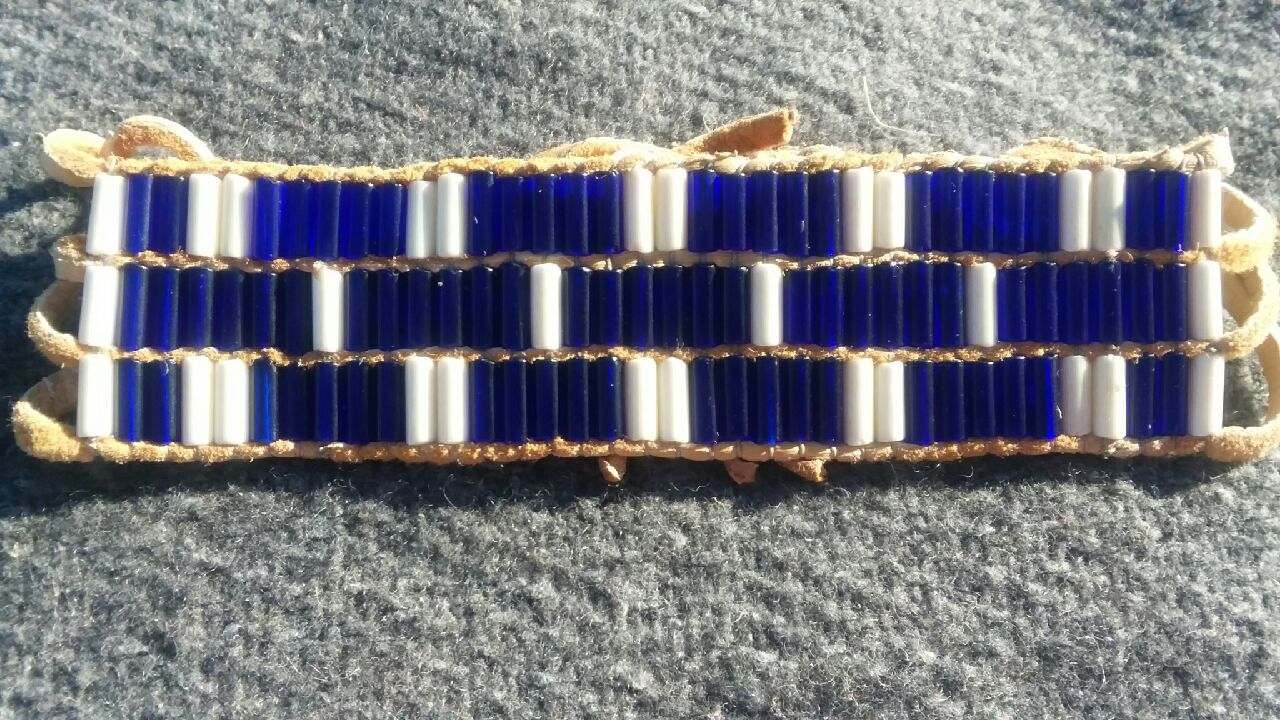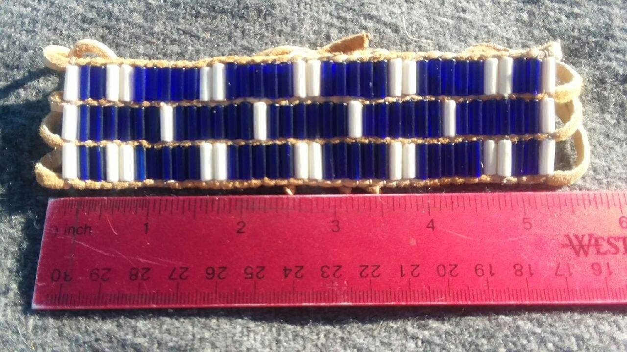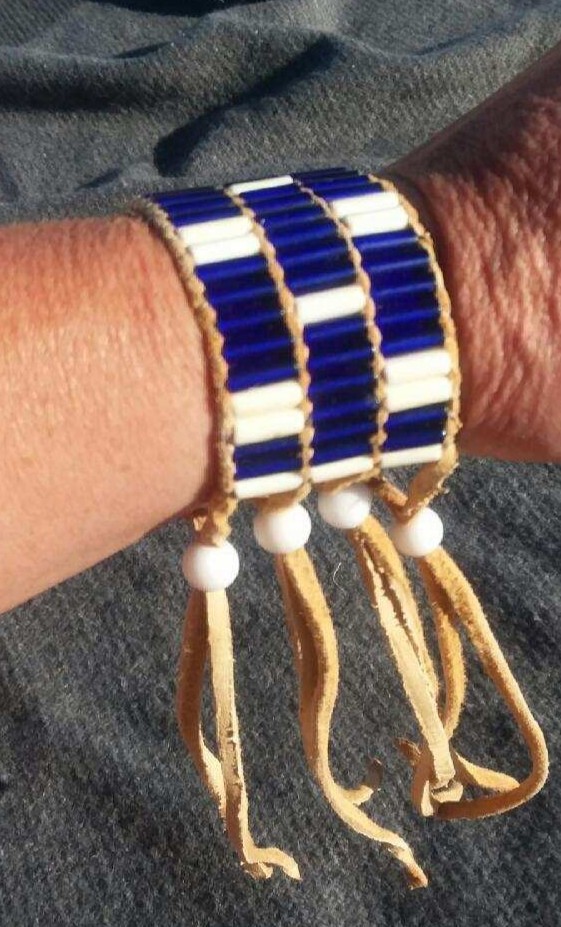 New, handmade cuff bracelet made with cobalt & ivory Glass Wampum beads woven onto deer leather lacing and finished with white glass Padre beads. Beadwork measures approx 5" x 1.5" and total length of lacing is approx 16". It is fully adjustable to your size by sliding the Padre beads on the lacing; model's wrist is about 6" diameter.