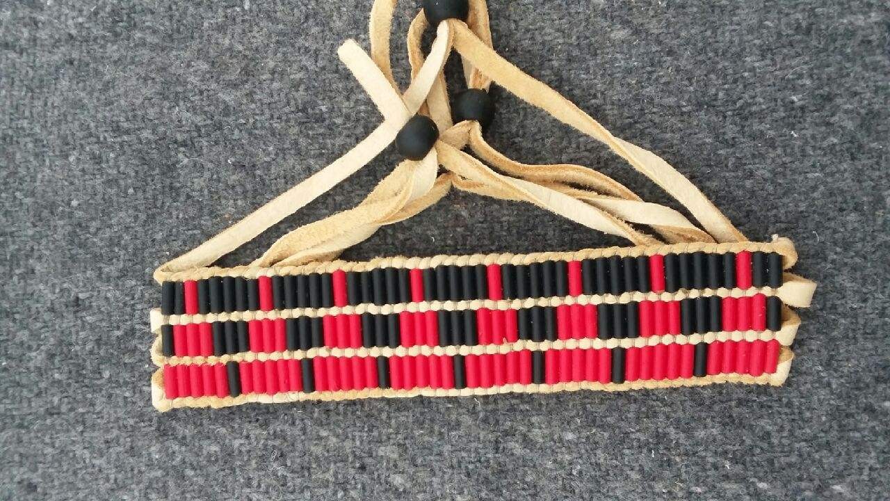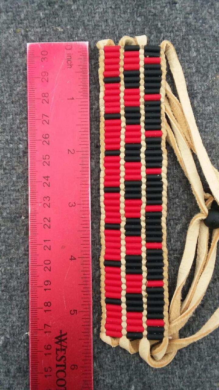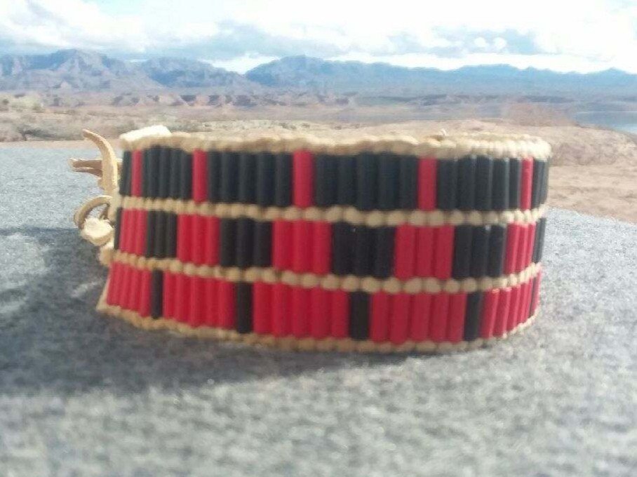 New, handmade cuff bracelet made with red & black glass wampum beads woven onto deer leather lacing and finished with black glass Padre beads. Beadwork measures approx 5.5 x 1" and total length of lacing is approx 16". It is fully adjustable to your size by sliding the Padre beads on the lacing.