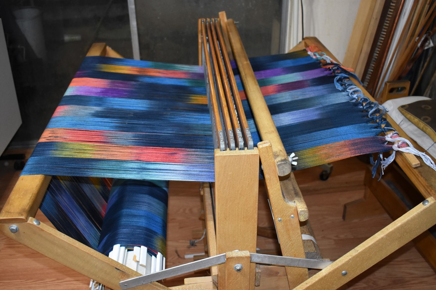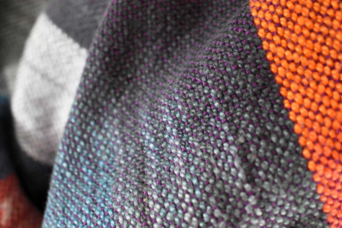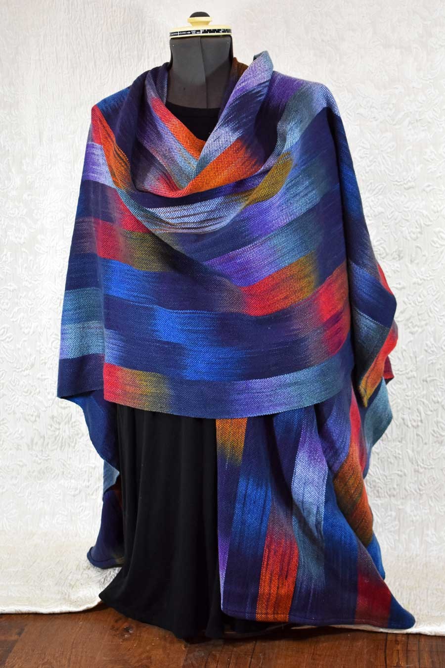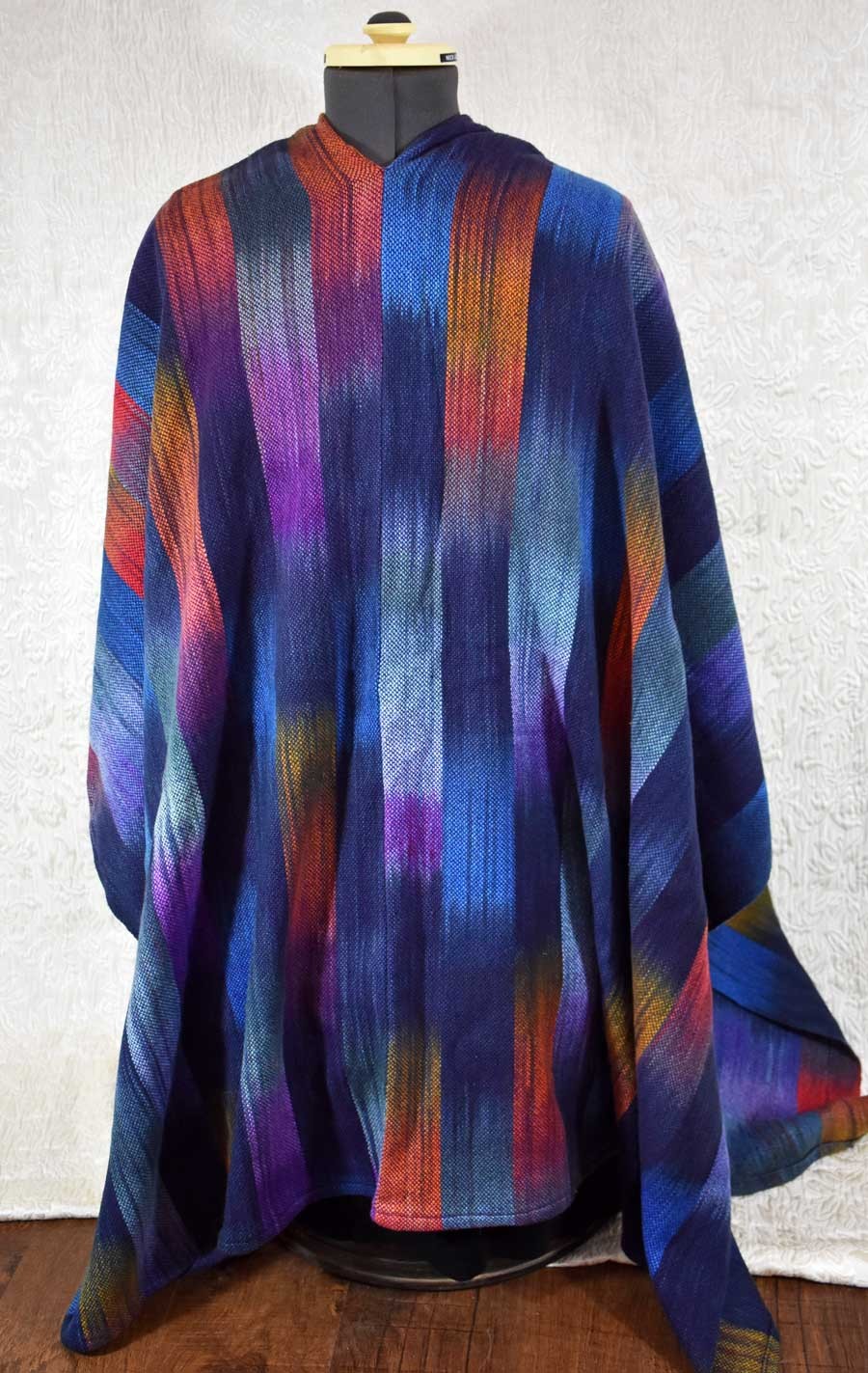 Here's a lovely multicolored ruana wrap for you. I hand dyed the cotton yarn in a myriad of colors, and then hand wove it on my floor loom with a tencel weft for extra drape. It is formed of 2 rectangular panels, sewn up the back. I have a few that I wove for myself years ago, and I wear them often for a nice wrap for chilly weather. Ruanas are particularly nice when traveling, since they can double as an extra layer in an airplane, or tossed over a bed or sleeping bag. Machine washable.
