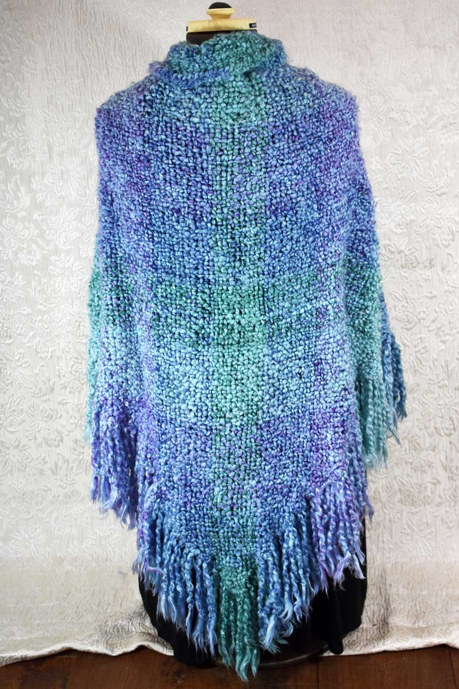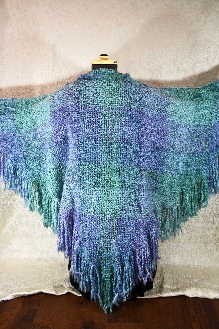 This is an incredibly soft and cuddly handwoven triangular shawl with fringe, in a