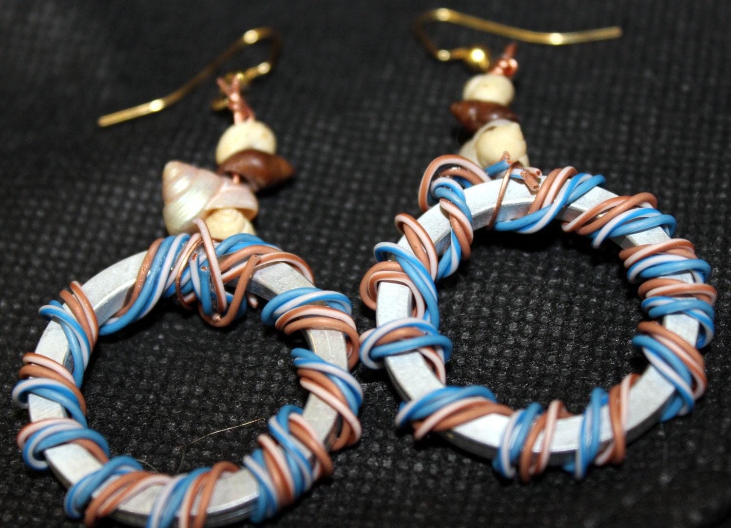 Earrings made from recycled computer hard drive spindle rings, cat5 wire, and sea shells. The seashells were brought back from the South Seas by my grandpa when he came back from WWII These earrings are a unique piece of wearable art. These earrings are lightweight. PDD052