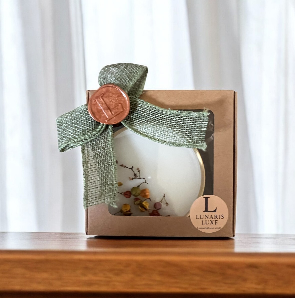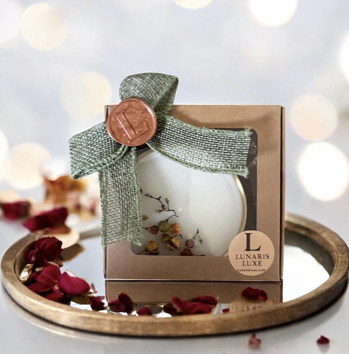 These candles are elegant and artistic — their white wax with delicate dried botanicals in golden bowls gives a serene, nature-inspired luxury feel. Burn time 9 hours
