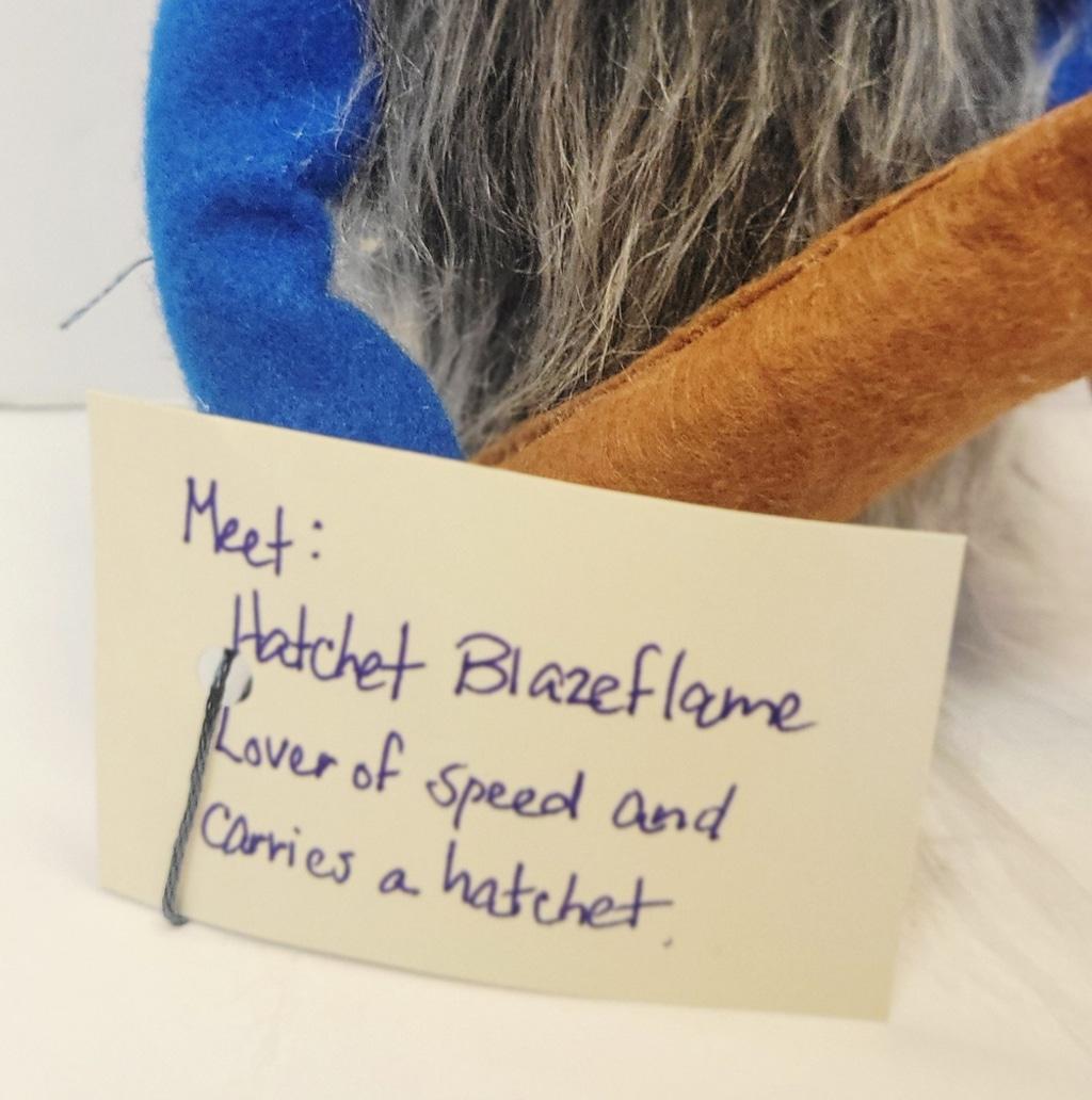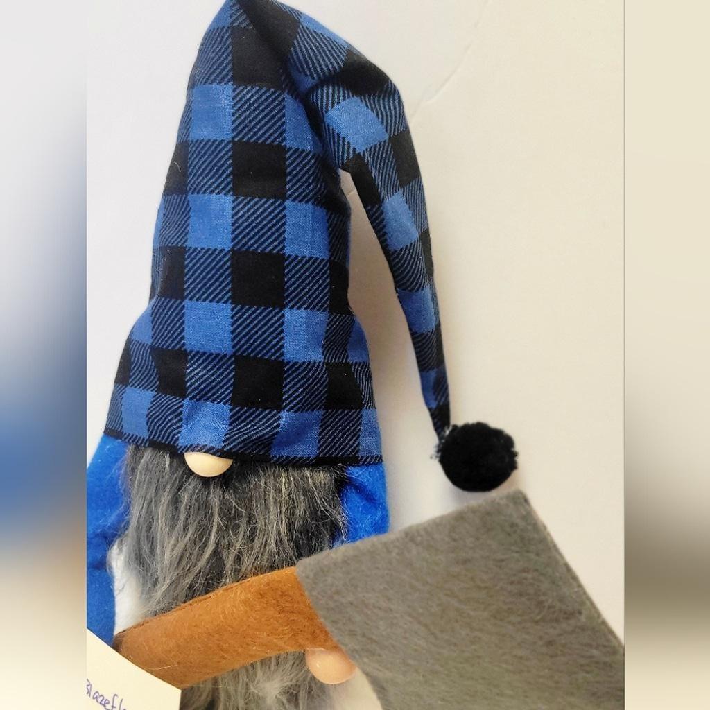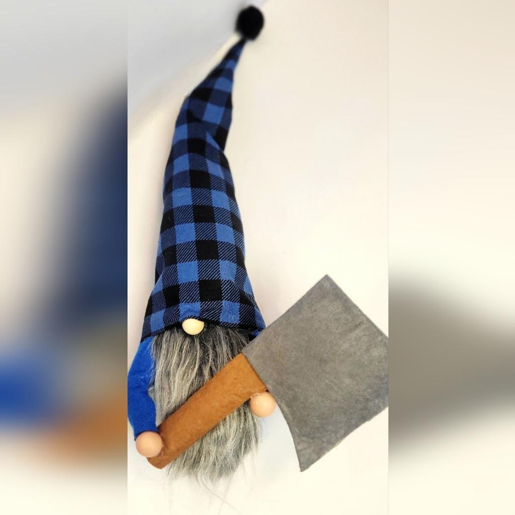 Meet Hatchet Blazeflame, lover of speed, and carries a hatchet. Hatchet is a OOAK handmade Gnome made with love and premium materials. He stands 6" tall, 16" to the tip of his blue and black plaid hat, with a matching black pompom. He is weighted with rice and poly-fil, with a bright blue felt top, poseable arms, clay hands, holding a 6.5" felt hatchet. He has a wood nose and a long, flowing Mongolian gray beard made from faux fur. Hat color choices are in the photos, felt top colors vary, please message for availability, and beard colors are as follows: Light gray, dark gray, Mongolian gray, white, fawn, red, acid green, brown, and black. Please allow me 1 day to create your custom gnome and then promptly shipped. Hatchet gnome size and tool may vary slightly.