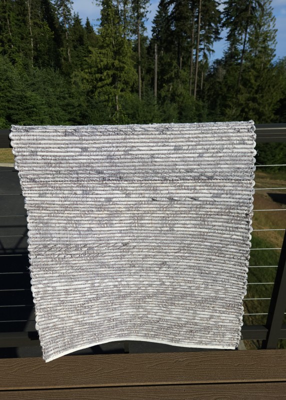 This is a rag rug woven in a Thick-Thin pattern with light gray/tan/white flannel sheet strips alternating with mop cotton hand dyed medium gray. It is finished with a rolled hem.