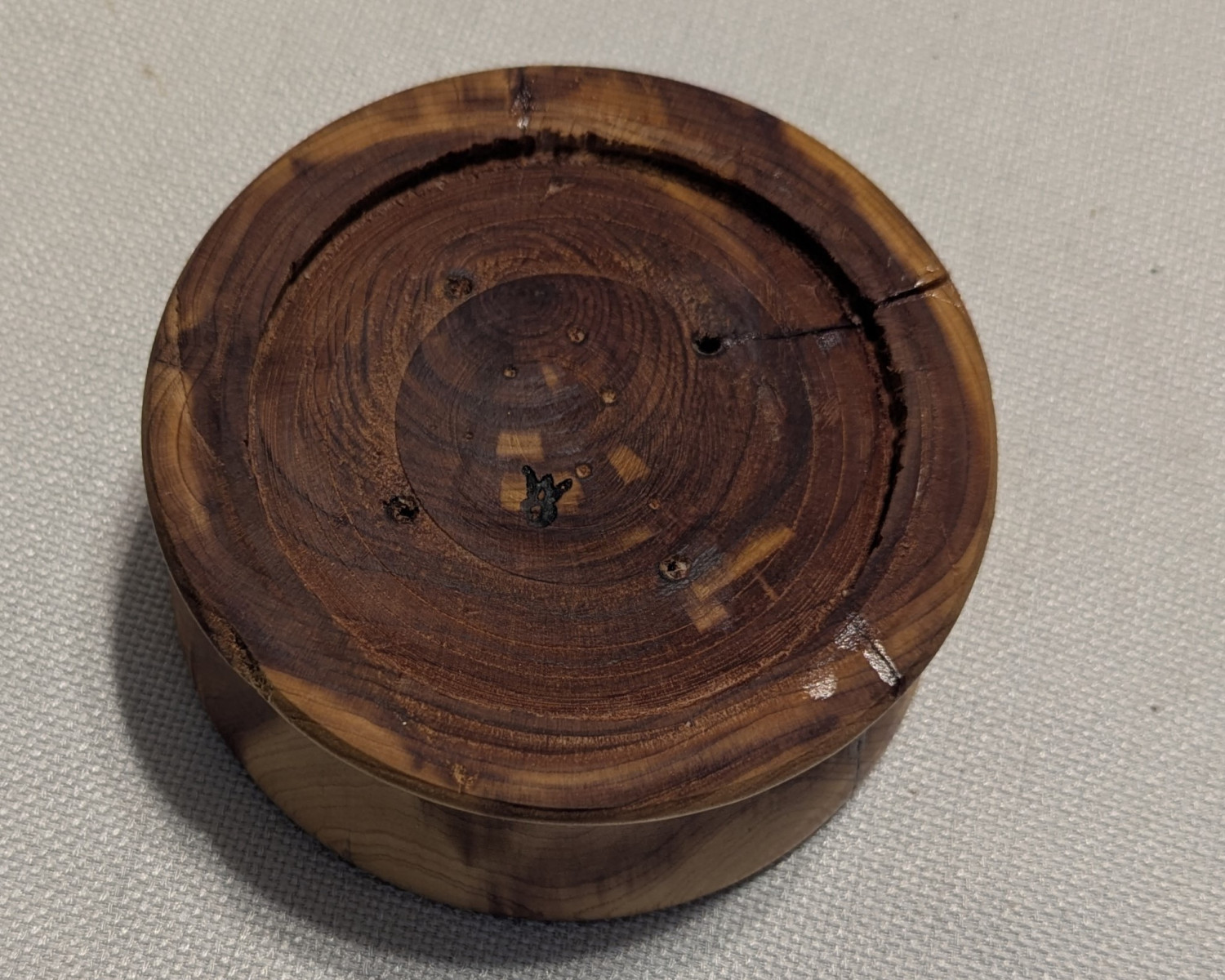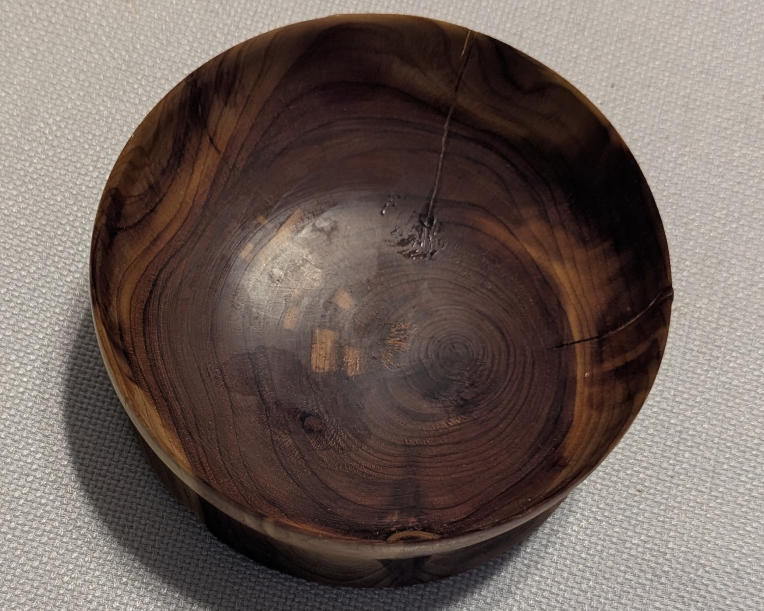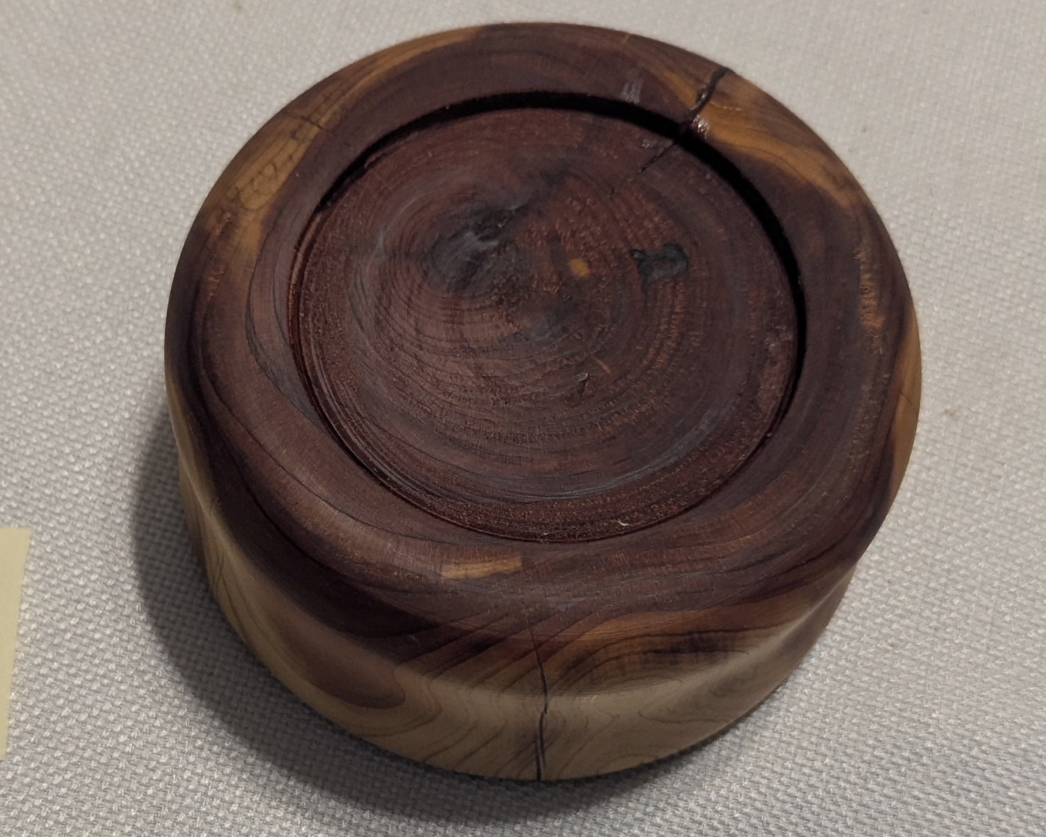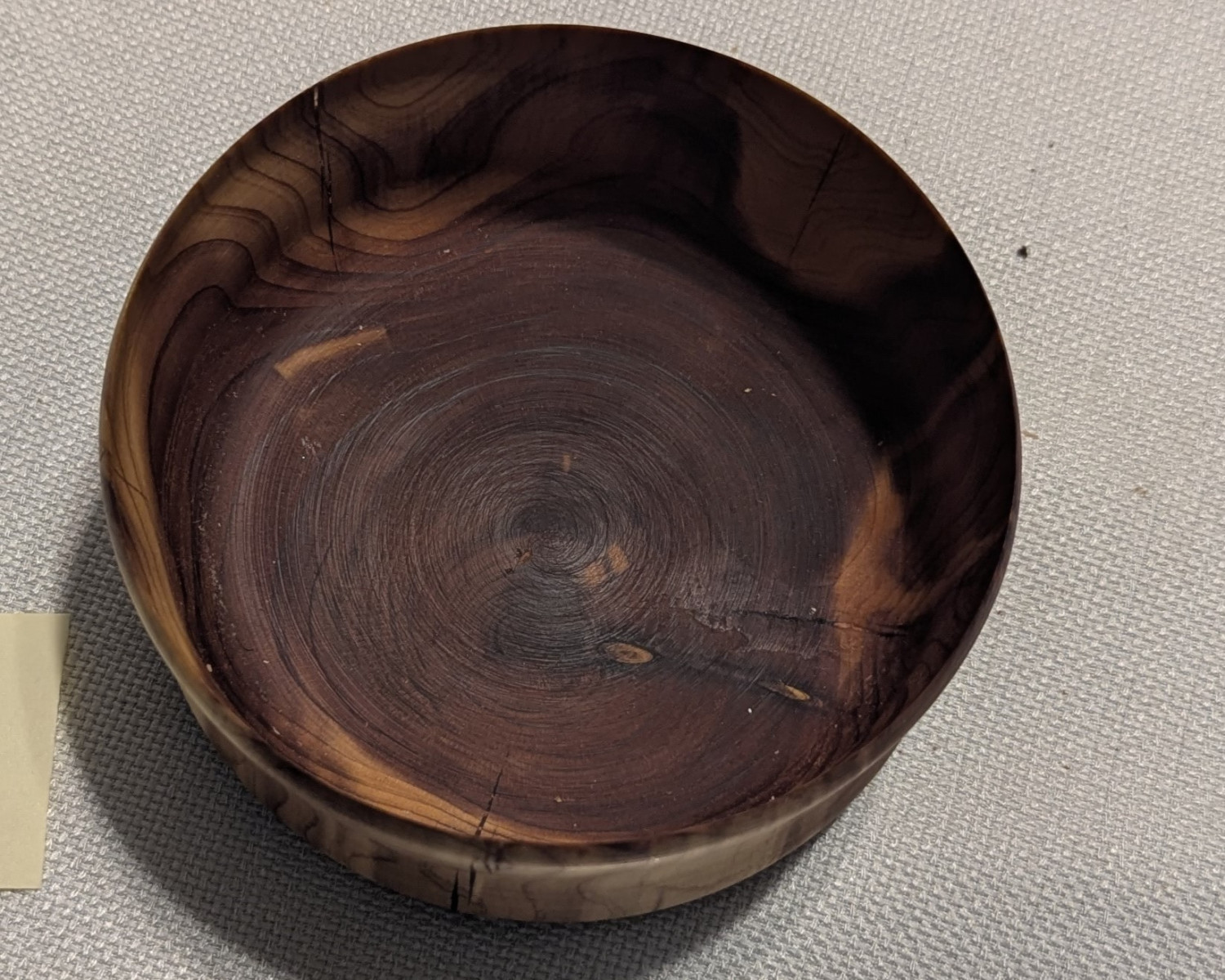 A pair of end-grained turned red cedar; high contrast between red heartwood and pale sapewood, glossy finish from teak oil. Both approx. 5" wide and 2" tall. Price is per bowl.