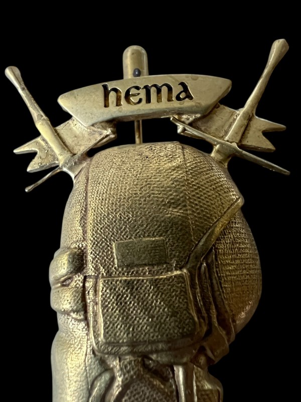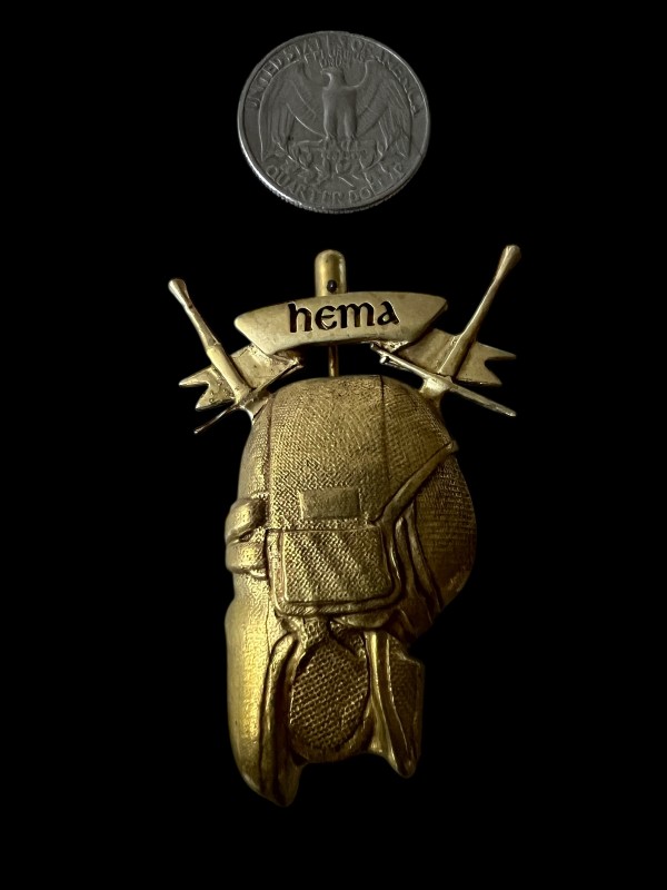 Proclaim your interest in Historical European Martial Arts (HEMA), with this bold pin featuring a HEMA-style mask and two crossed sword hilts, one Italian and the other German. We've hollowed this one out so it's not quite so heavy!
