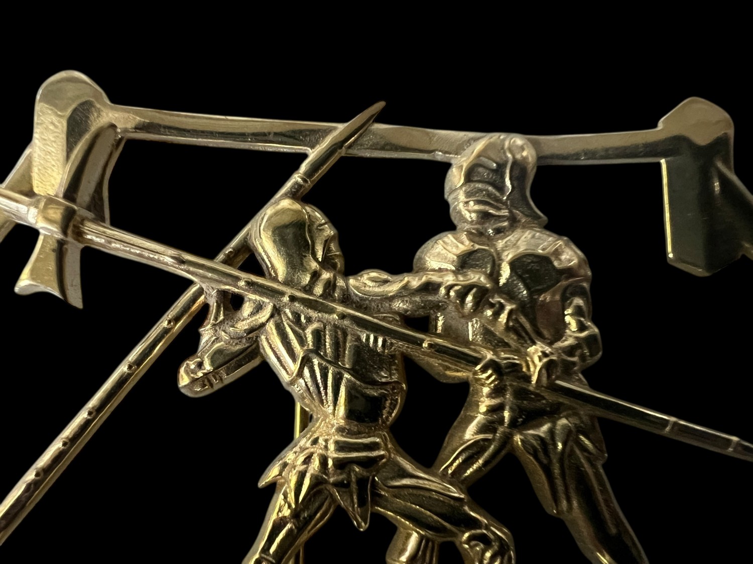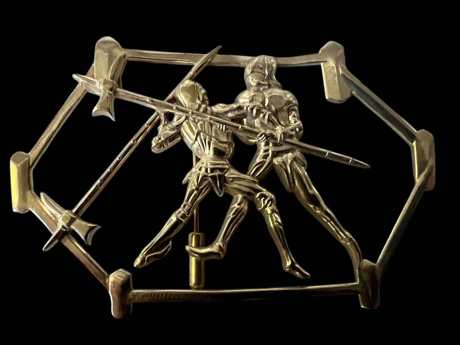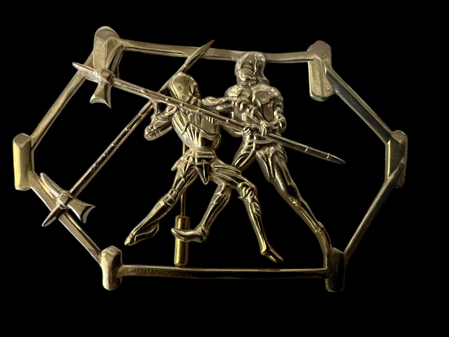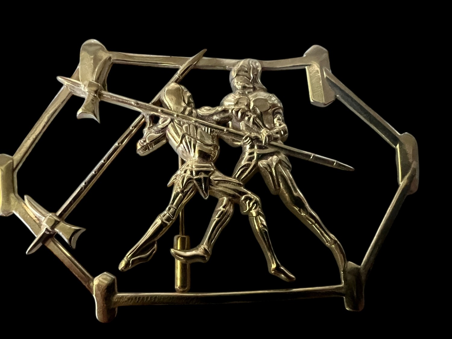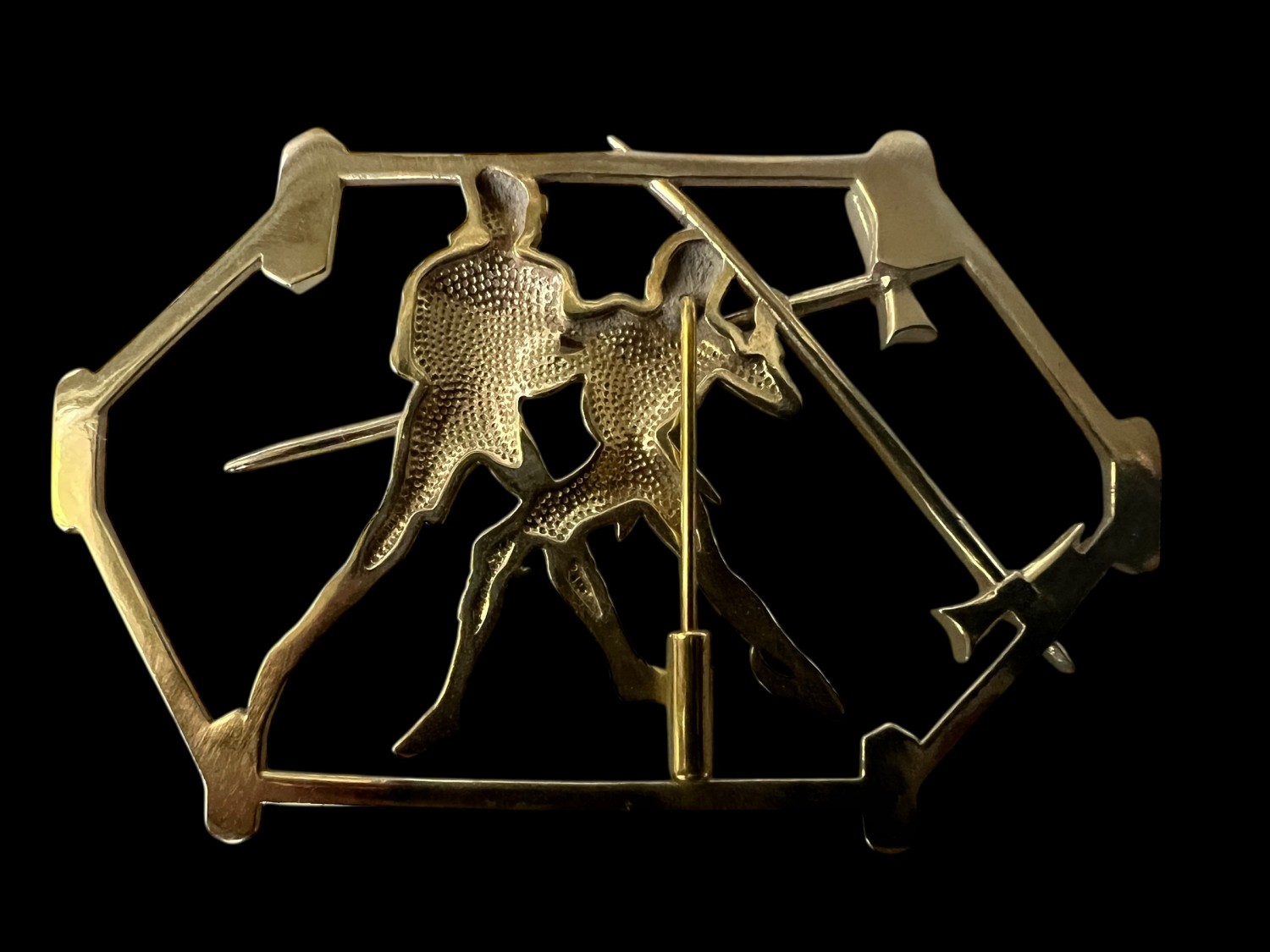 The REALLY BIG pin depicts two of Talhoffer's combatants from a knightly duel published in 1459, fighting the poleaxes.