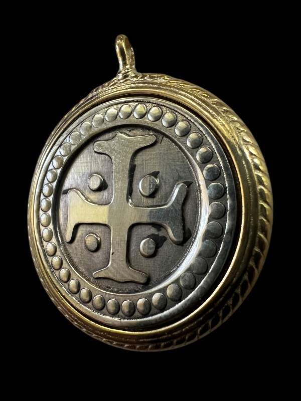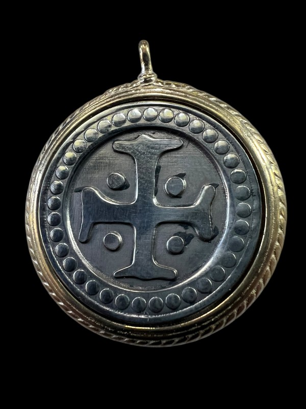 Set into our medium-sized medieval (15th century) pendant frame, we've added a medieval cross. This one was found in the I.33 sword and buckler treatise from the Royal Armouries, at Leeds in the UK. It dates from the late 13th or into the early 14th century, and the cross marks the place in the fighting manuscript where the sequence begins.
