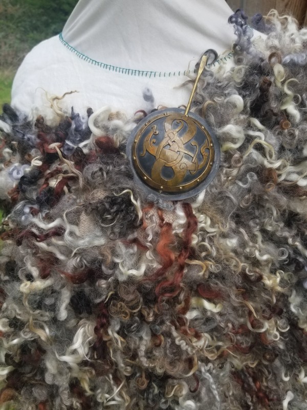 This pile woven cloak is created based off the Icelandic cloaks. It is shorter, as 3 yards of cloak could be unwieldy; this cloak measures 33"wide x 60" long. It is hand woven in a twill and has twice as many locks as Icelandic law demanded, so you see no fabric through the locks of wool. The wool is from 6 different breed of sheep, Cotswold, Leicester, Gotland, Wensleydale, Lincoln, and Teeswater. Ends are hand sewn with the same wool as the weaving. There will likely