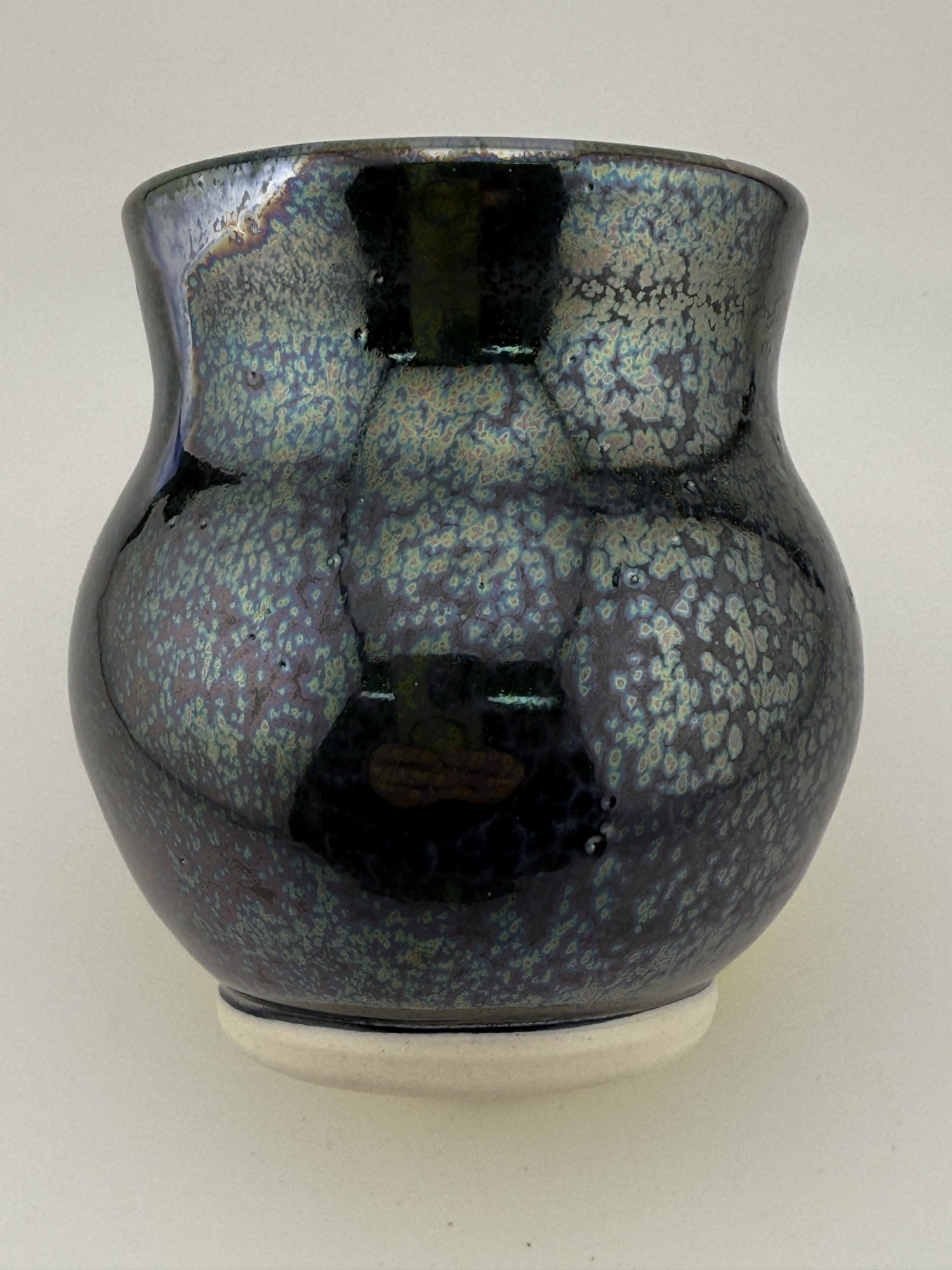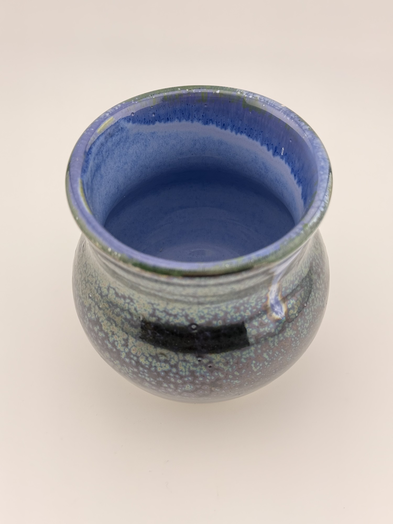This striking small vessel is a true jewel of the kiln. Measuring 3 inches wide by 3.5 inches tall, it features a vibrant, textured blue glazed interior. The exterior is a deep, moody blue adorned with shimmering metallic crystals that give it an otherworldly, iridescent finish. Handcrafted with intention and fire-kissed into uniqueness, this piece is perfect as a decorative accent or a small functional treasure.