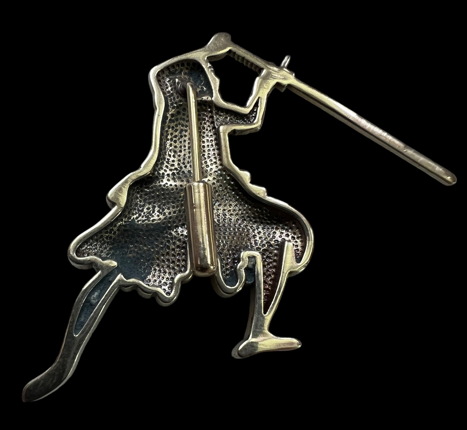 This pin is good-sized, reproducing lots of detail. It's made from jewelers' brass, which reproduces detail beautifully, and it features a simple stick-pin style attachment point on the back, fitted with a friction cap to keep it in place.