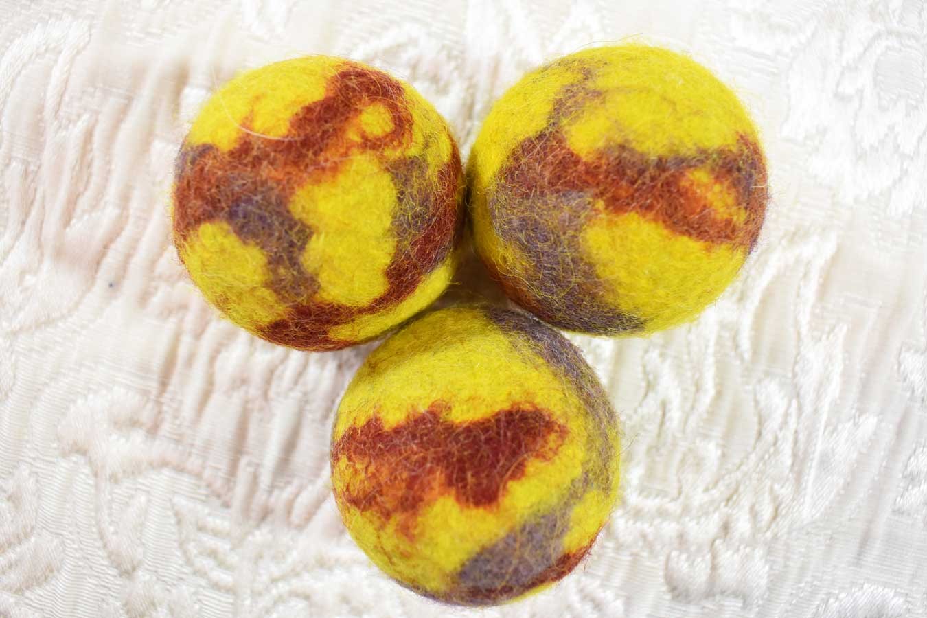 This is a set of 3 juggling balls, in yellow, red, and purple. They are made of a seamless outer layer of wool for a good grip, hand felted around a golf ball core for weight. Three balls fit nicely into the hand. My juggling friends love these!