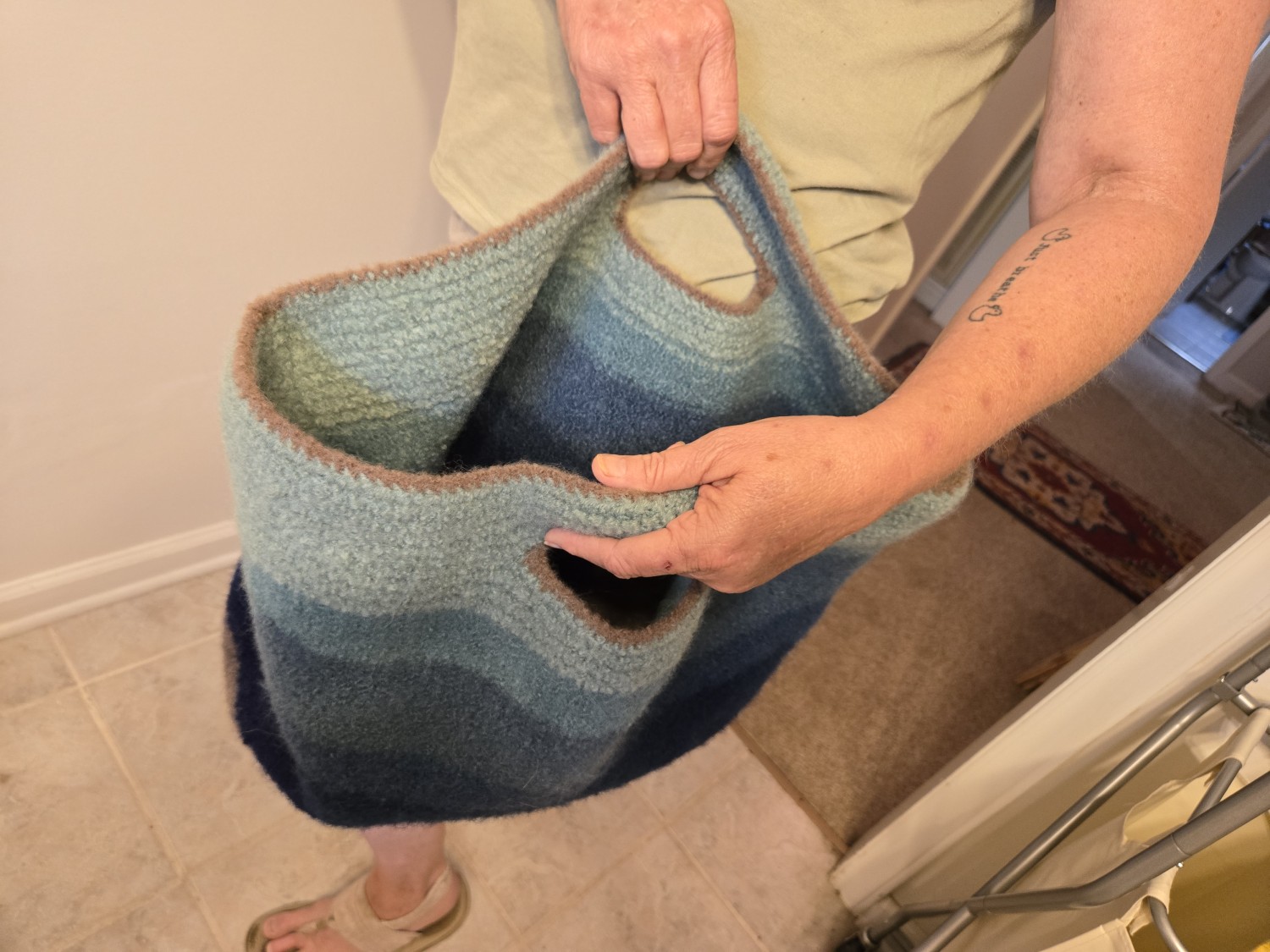 A handwoven and felted wool handbag. Created by Lisa Cunningham out of California and graciously donated to support the Rebecca Romero Hunting Legacy Scholarship.