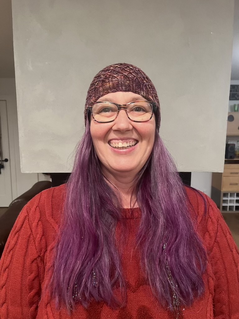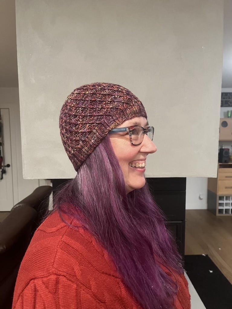 Knitted in 100% Merino Wool, this hat measures 8 in x 7 in and has a circumference of 16 in un-stretched.
