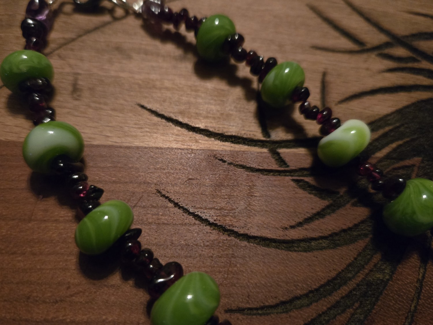 Custom made lamp work glass bead necklace. Green and white twisted cane to create "Damascus" <layered> green beads. Adorned with flattened circular black beads accented with rough garnets and accented metal spacers. Stung on braided wire at 22.5 inches in length. Bullseye glass and annealed for increased durability.