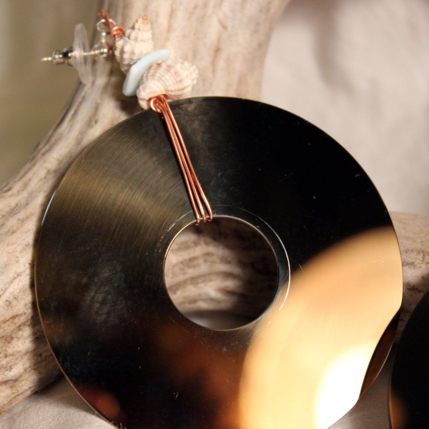 Earrings made from recycled laptop computer hard drive platters and sea shells. A unique piece of wearable art. These earrings are lightweight. Each disc is 2.5 inches across. PDD109