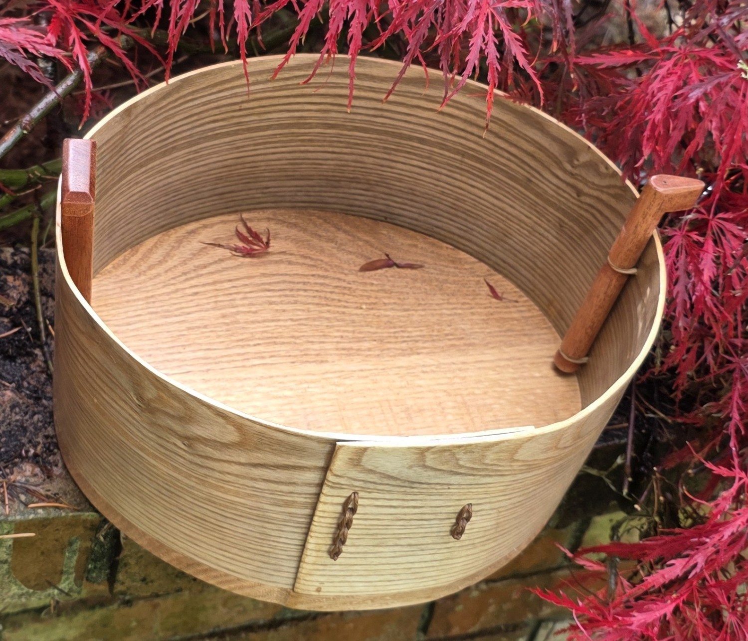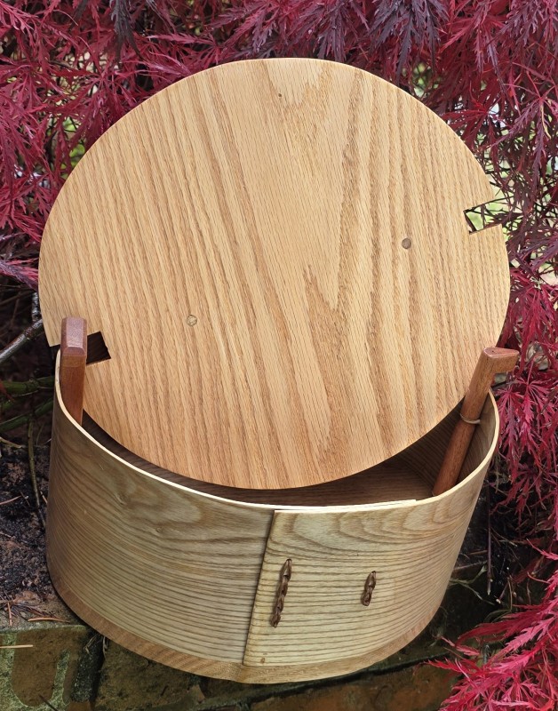 Oxidized Ash body with Oak top and base, Sapele handle and locks. Inner dimensions are 10 1/4" long, 10 5/8" wide, 4 1/2" deep. Inspired by historical boxes fond throughout Scandinavia known as tiner. These boxes are individually crafted by a veteran craftsman for your reenactment needs, decoration, or every day use.