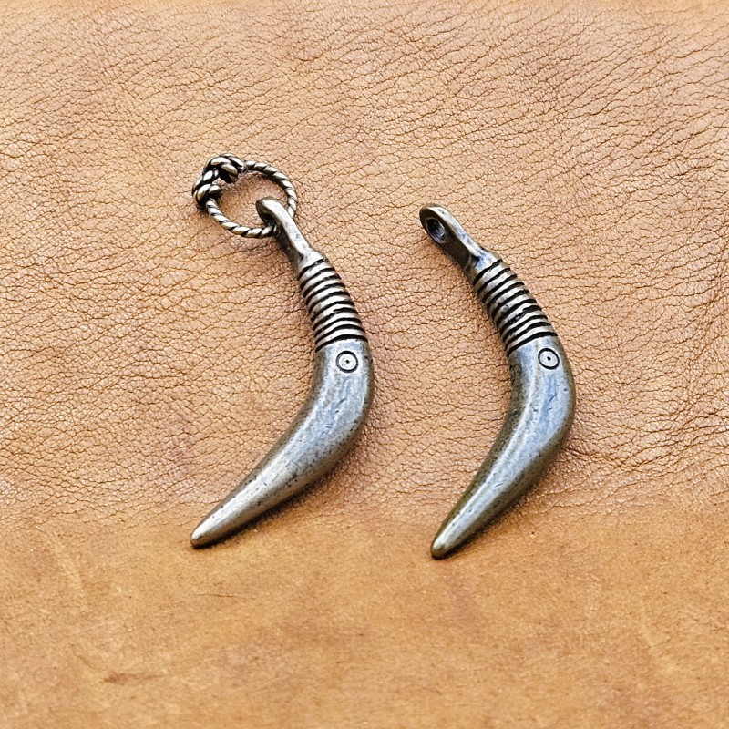 Description: Late Iron/Viking Age bear tooth pendant. Found in Finland in multiples per pendant, this single is suitable for use as a necklace or otherwise suspended via jump ring or hole drilled in the end.