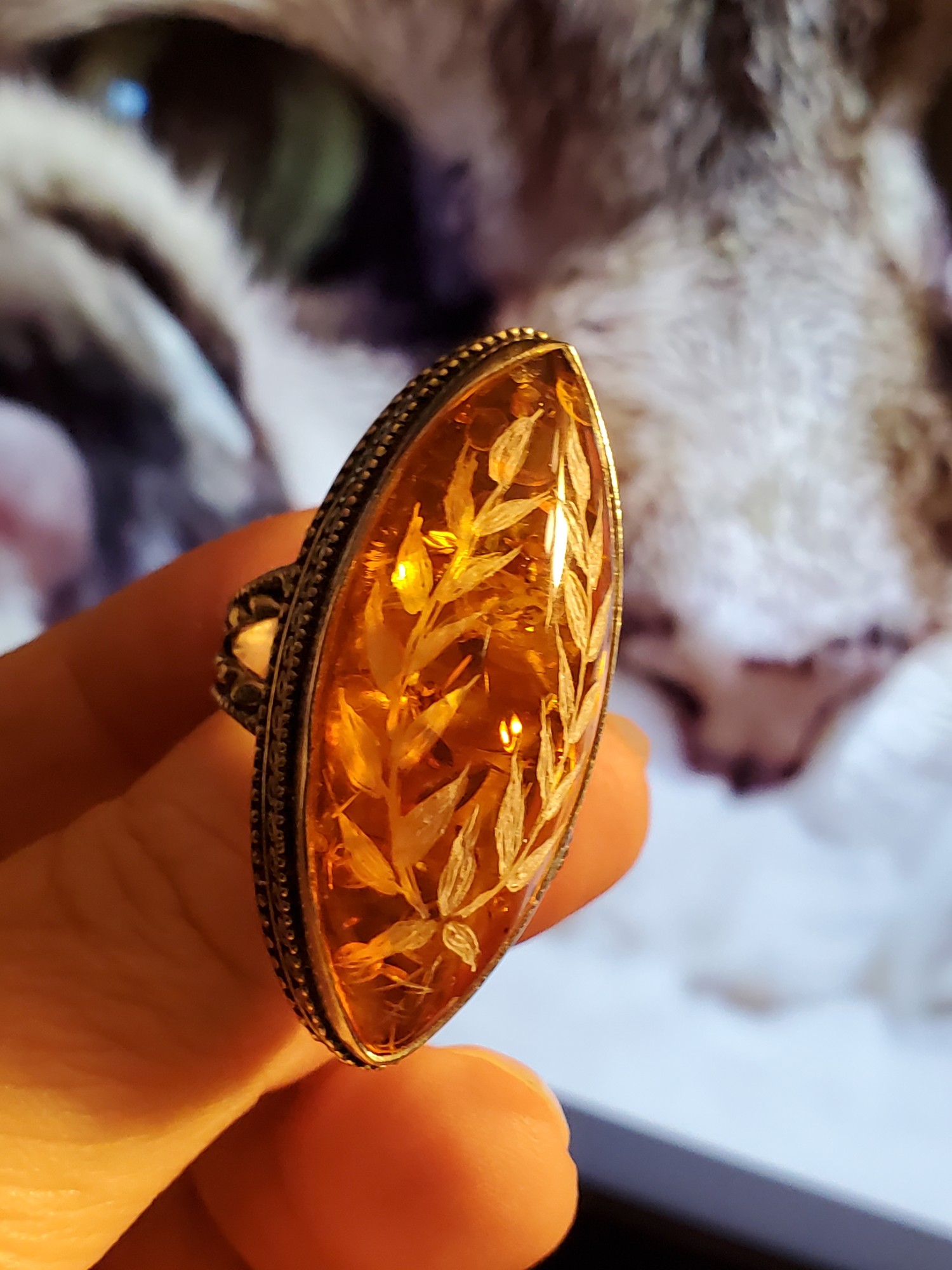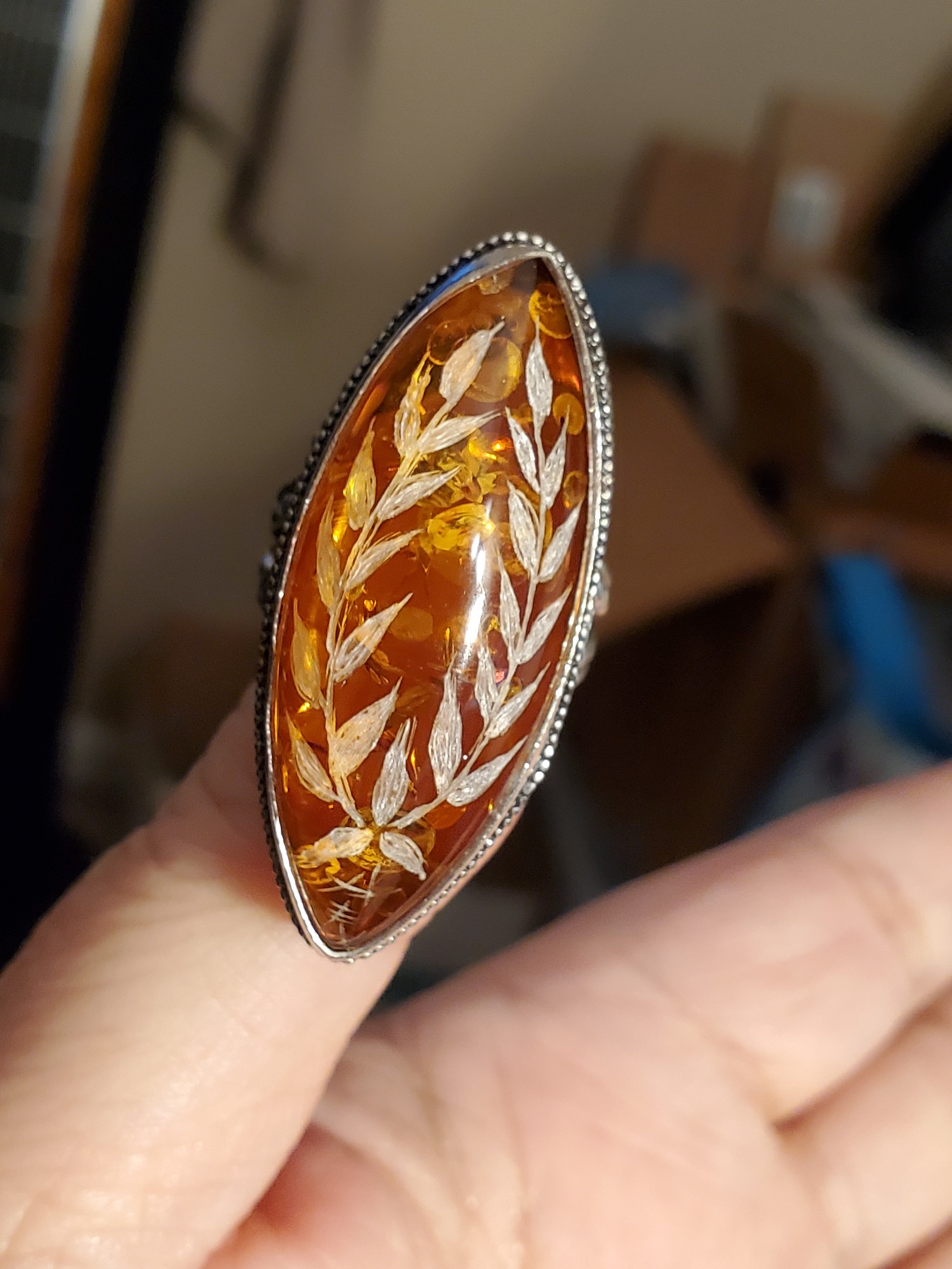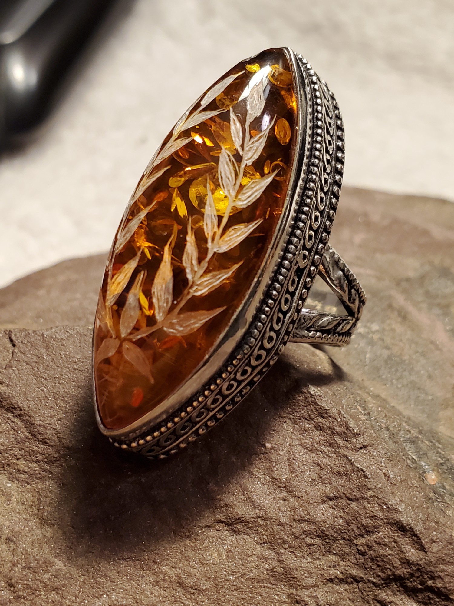 Laurel Intaglio Amber in Sterling Silver Ring 8.75