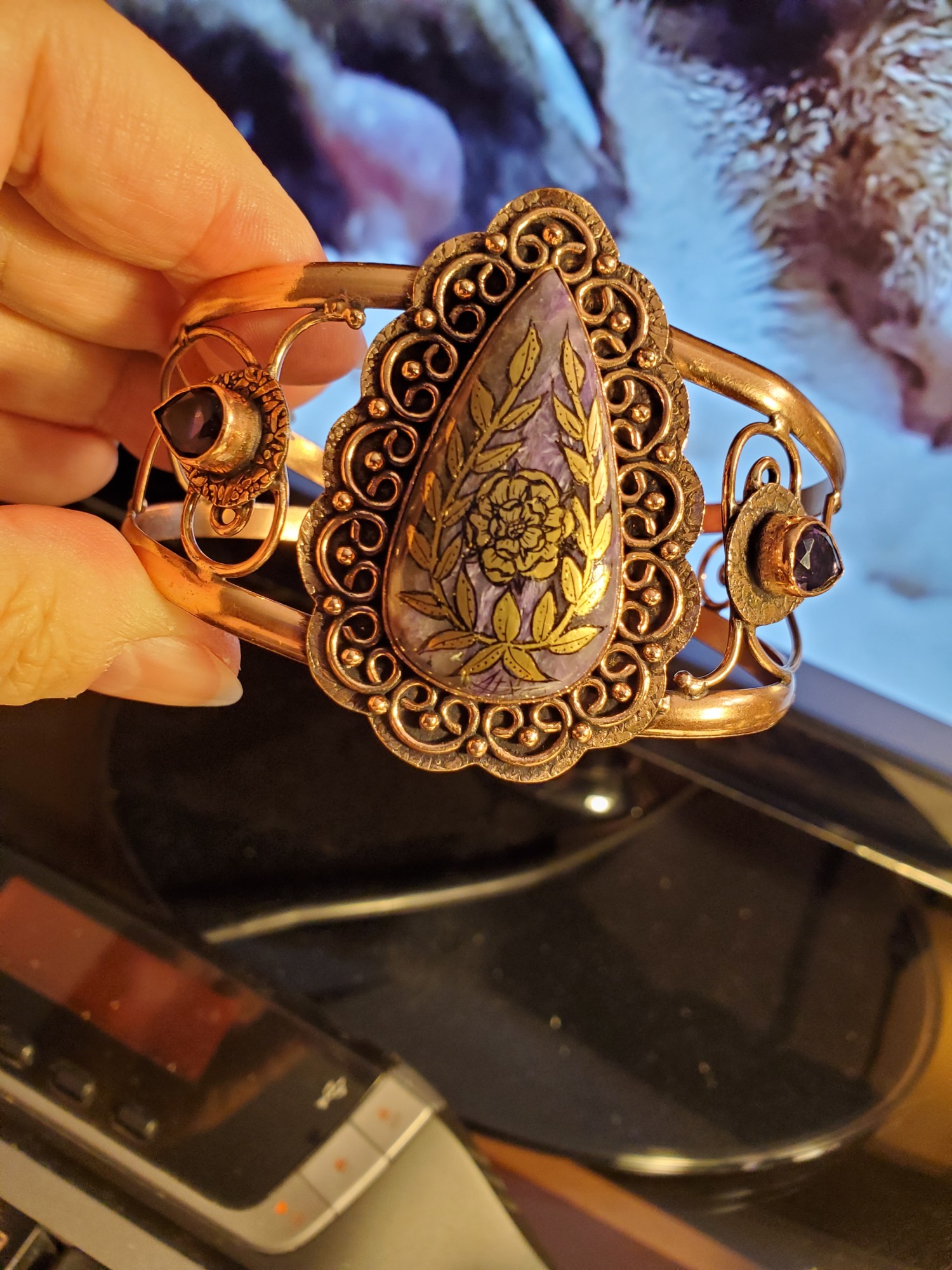 Amethyst in Copper, Gold Leaf Enamel and outlined with a Cat's Whisker, this is a One of a Kind Jewel and fits medium to large wrist easily.