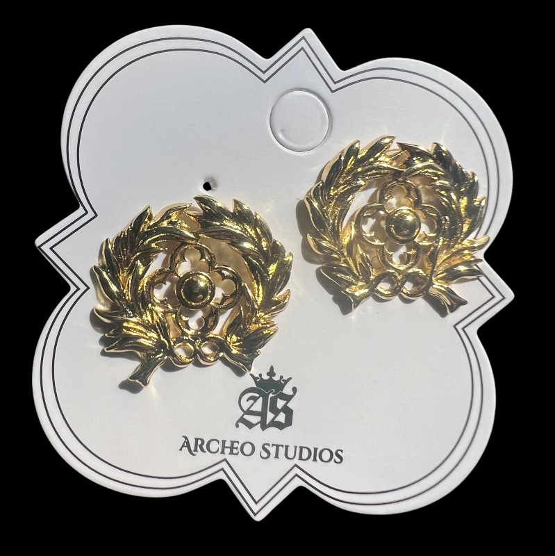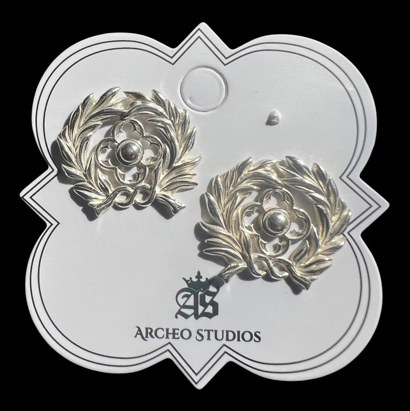 Sterling silver laurel post earrings, 5/8" across, featuring a quatrefoil filling the central space. Available in sterling or plated in 18k gold.