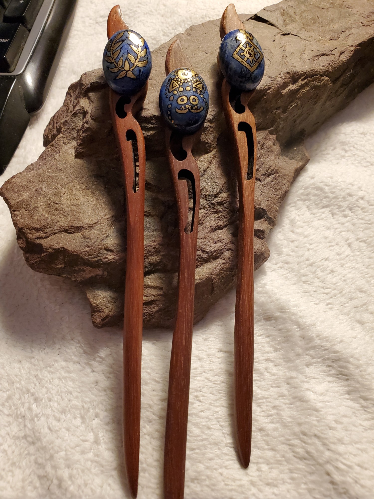 Hair SticksTeak Wood and Lapis LazuliCrushed Gold Leaf Enamel and Cat Whisker inked outlines #ATSGalleries, #AlextheScribe, #drifasleap, #lapislazuli, #hairstick