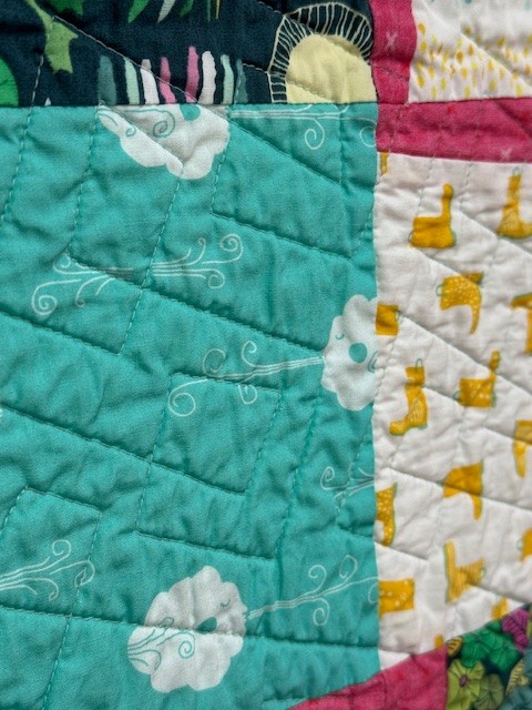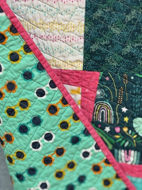Bring a splash of color and cheer to any room with this handmade Leap of Luck Quilt! Featuring playful frogs, rainbows, mushrooms, and floral prints in shades of aqua, green, and sunshine yellow, this quilt radiates joy and whimsy. The vibrant raspberry-pink lightning bolt sashing ties it all together, creating a bold, modern frame for each block.
